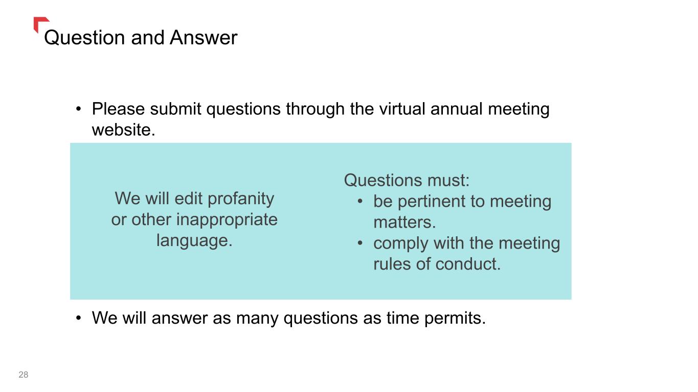 Question and Answer 28 • Please submit questions through the virtual annual meeting website. • We will edit profanity or other inappropriate language. • Questions must: • Be pertinent to meeting matters • Be appropriate • Comply with the meeting rules of conduct • We will answer as many questions as time permits. We will edit profanity or other inappropriate language. Questions must: • be pertinent to meeting matters. • comply with the meeting rules of conduct.