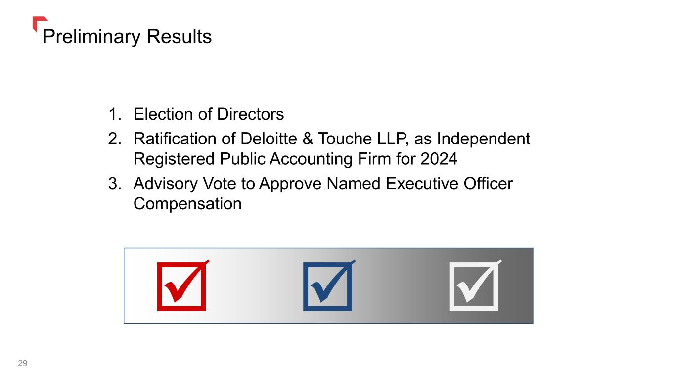 Preliminary Results 29 1. Election of Directors 2. Ratification of Deloitte & Touche LLP, as Independent Registered Public Accounting Firm for 2024 3. Advisory Vote to Approve Named Executive Officer Compensation