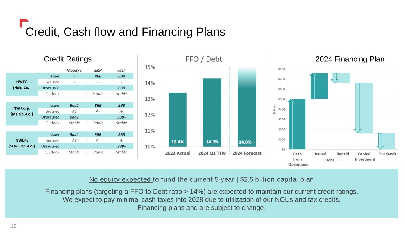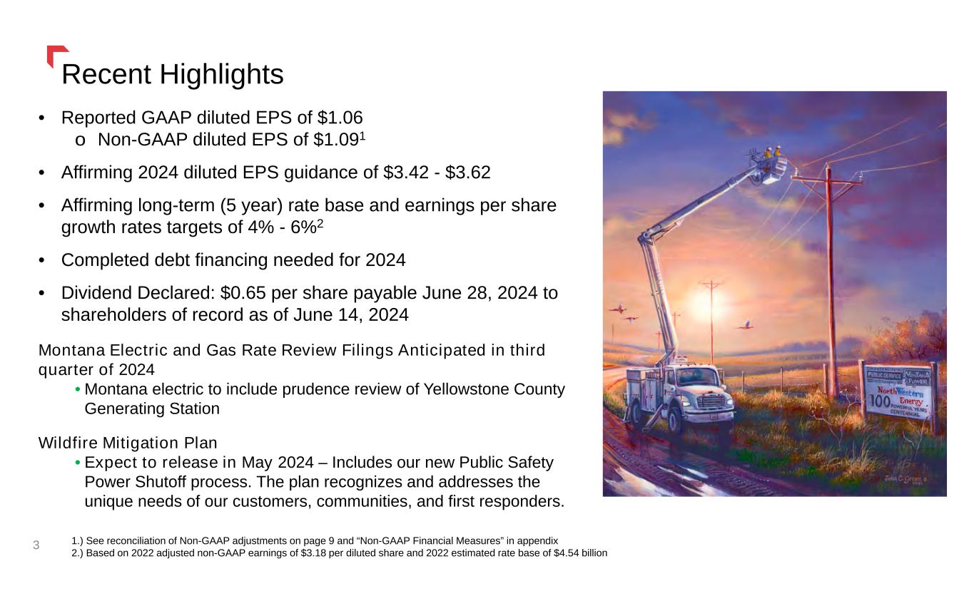 Recent Highlights • Reported GAAP diluted EPS of $1.06 o Non-GAAP diluted EPS of $1.091 • Affirming 2024 diluted EPS guidance of $3.42 - $3.62 • Affirming long-term (5 year) rate base and earnings per share growth rates targets of 4% - 6%2 • Completed debt financing needed for 2024 • Dividend Declared: $0.65 per share payable June 28, 2024 to shareholders of record as of June 14, 2024 Montana Electric and Gas Rate Review Filings Anticipated in third quarter of 2024 • Montana electric to include prudence review of Yellowstone County Generating Station Wildfire Mitigation Plan • Expect to release in May 2024 – Includes our new Public Safety Power Shutoff process. The plan recognizes and addresses the unique needs of our customers, communities, and first responders. 1.) See reconciliation of Non-GAAP adjustments on page 9 and “Non-GAAP Financial Measures” in appendix 2.) Based on 2022 adjusted non-GAAP earnings of $3.18 per diluted share and 2022 estimated rate base of $4.54 billion 3