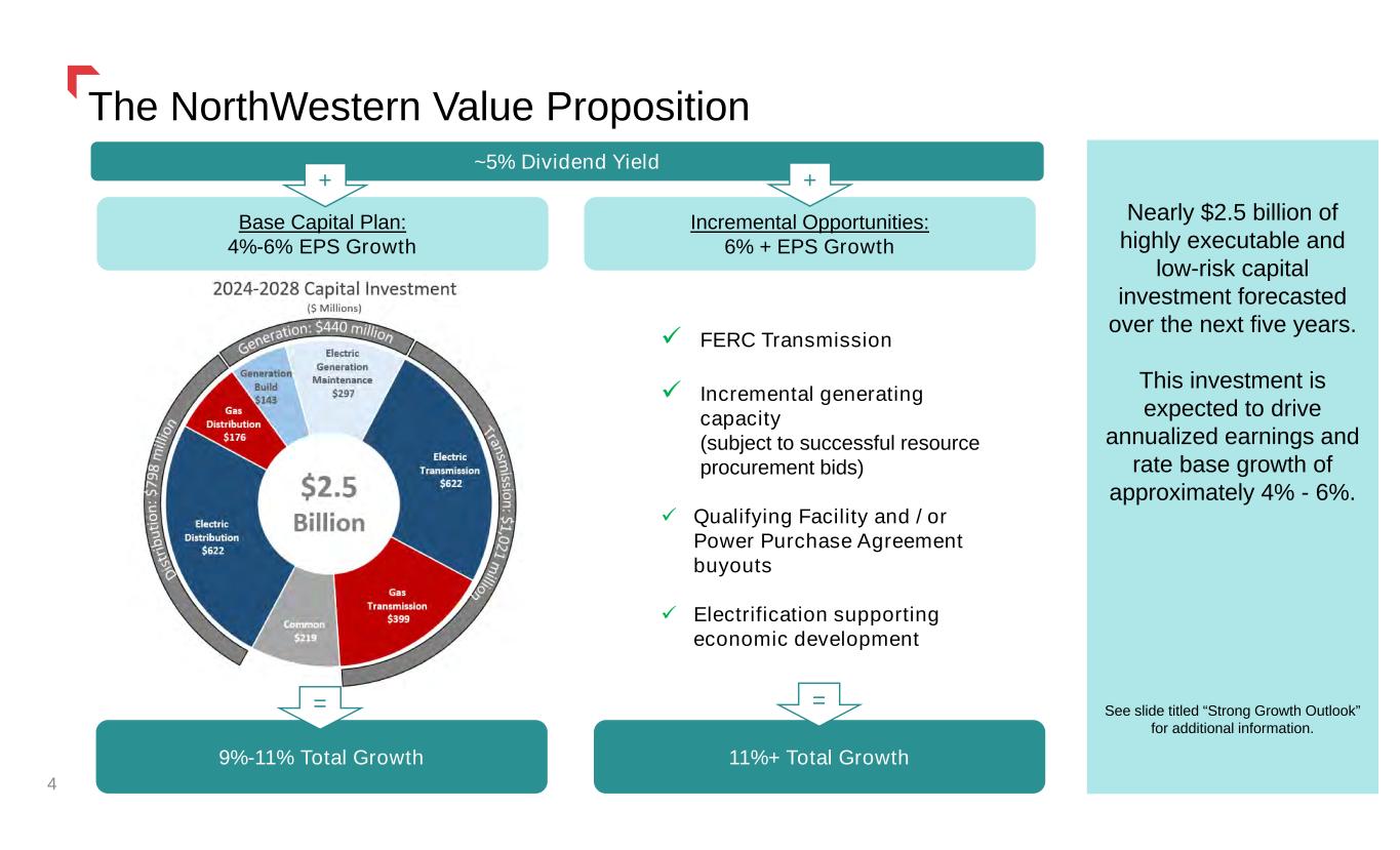 9%-11% Total Growth 11%+ Total Growth Incremental Opportunities: 6% + EPS Growth ~5% Dividend Yield Base Capital Plan: 4%-6% EPS Growth FERC Transmission Incremental generating capacity (subject to successful resource procurement bids) Qualifying Facility and / or Power Purchase Agreement buyouts Electrification supporting economic development Nearly $2.5 billion of highly executable and low-risk capital investment forecasted over the next five years. This investment is expected to drive annualized earnings and rate base growth of approximately 4% - 6%. See slide titled “Strong Growth Outlook” for additional information. + The NorthWestern Value Proposition + 4 = =