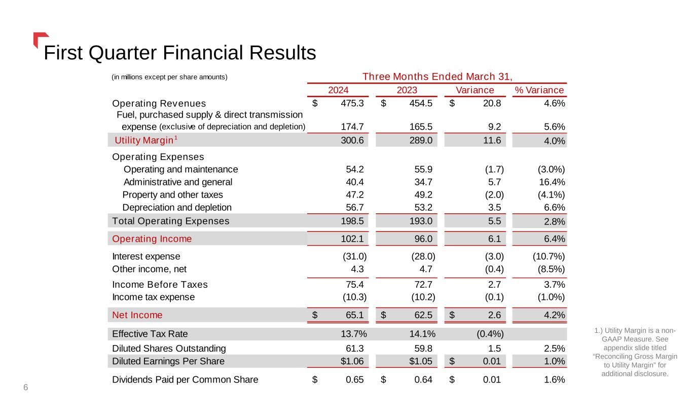 We define Utility Margin as Operating Revenues less fuel, purchased supply and direct transmission expense (exclusive of depreciation and depletion) as presented in our Consolidated Statements of Income. This measure differs from the GAAP definition of Gross Margin due to the exclusion of Operating and maintenance, Property and other taxes, and Depreciation and depletion expenses, which are presented separately in our Consolidated Statements of Income. A reconciliation of Utility Margin to Gross Margin, the most directly comparable GAAP measure, is included in the press release above.