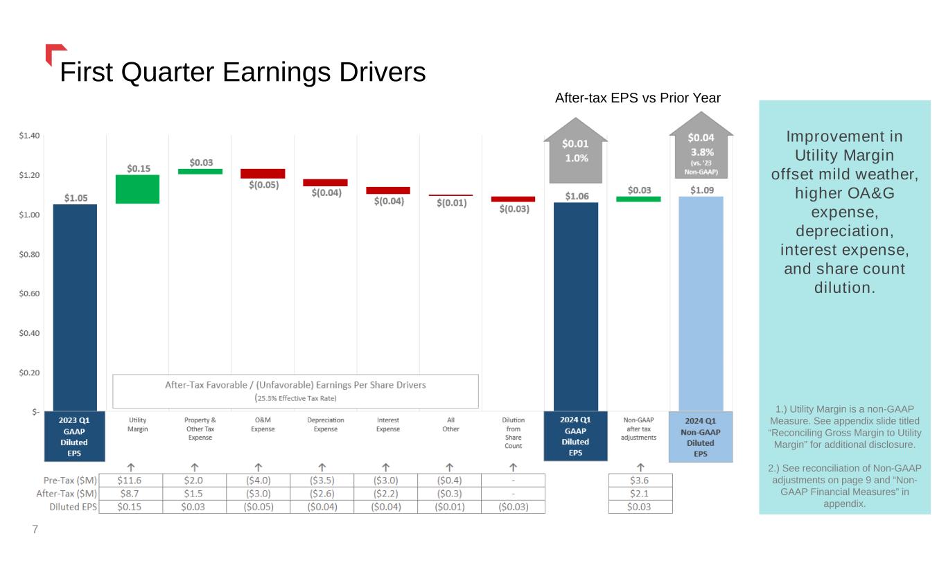 (in millions except per share amounts) 2024 2023 Variance % Variance Operating Revenues 475.3$ 454.5$ 20.8$ 4.6% 174.7 165.5 9.2 5.6% Utility Margin 300.6 289.0 11.6 4.0% Operating Expenses Operating and maintenance 54.2 55.9 (1.7) (3.0%) Administrative and general 40.4 34.7 5.7 16.4% Property and other taxes 47.2 49.2 (2.0) (4.1%) Depreciation and depletion 56.7 53.2 3.5 6.6% Total Operating Expenses 198.5 193.0 5.5 2.8% Operating Income 102.1 96.0 6.1 6.4% Interest expense (31.0) (28.0) (3.0) (10.7%) Other income, net 4.3 4.7 (0.4) (8.5%) Income Before Taxes 75.4 72.7 2.7 3.7% Income tax expense (10.3) (10.2) (0.1) (1.0%) Net Income 65.1$ 62.5$ 2.6$ 4.2% Effective Tax Rate 13.7% 14.1% (0.4%) Diluted Shares Outstanding 61.3 59.8 1.5 2.5% Diluted Earnings Per Share $1.06 $1.05 0.01$ 1.0% Dividends Paid per Common Share 0.65$ 0.64$ 0.01$ 1.6% Three Months Ended March 31, Fuel, purchased supply & direct transmission expense (exclusive of depreciation and depletion) 1 First Quarter Financial Results 6 1.) Utility Margin is a non- GAAP Measure. See appendix slide titled “Reconciling Gross Margin to Utility Margin” for additional disclosure.
