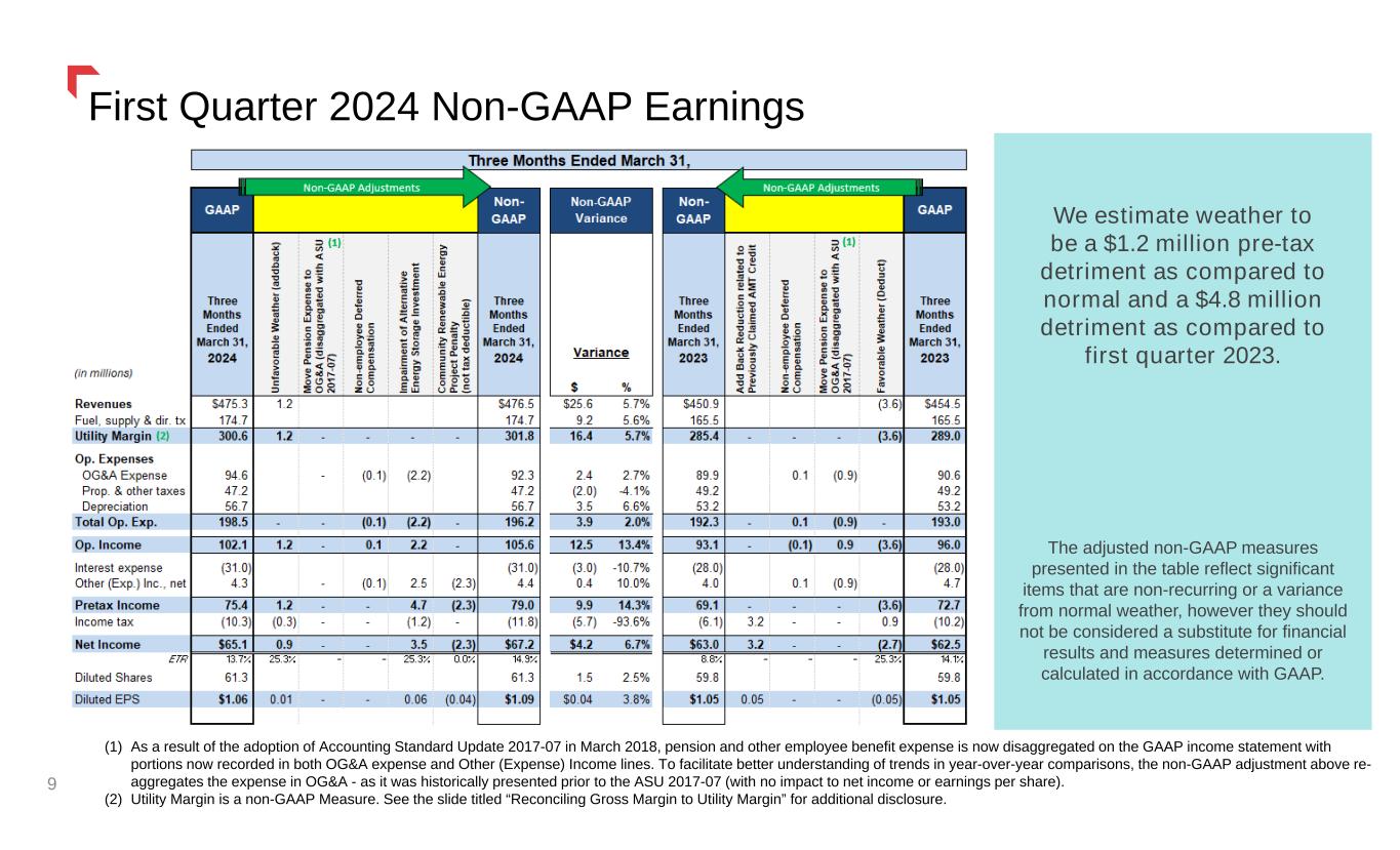 After-tax EPS vs Prior Year First Quarter Earnings Drivers 7 1 2 Improvement in Utility Margin offset mild weather, higher OA&G expense, depreciation, interest expense, and share count dilution. 1.) Utility Margin is a non-GAAP Measure. See appendix slide titled “Reconciling Gross Margin to Utility Margin” for additional disclosure. 2.) See reconciliation of Non-GAAP adjustments on page 9 and “Non- GAAP Financial Measures” in appendix.