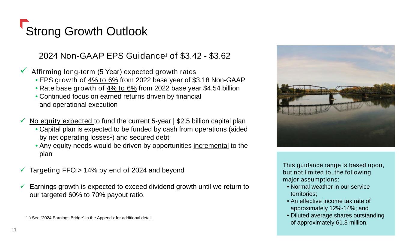 We are also affirming our long-term (5 year) diluted earnings per share growth guidance of 4% to 6% from a 2022 base year of $3.18 diluted earnings per share on a non-GAAP basis. We expect rate base growth of 4% to 6%. Our current capital investment program is sized to provide for no equity issuances. Future generation capacity additions or other strategic opportunities may require equity financing.