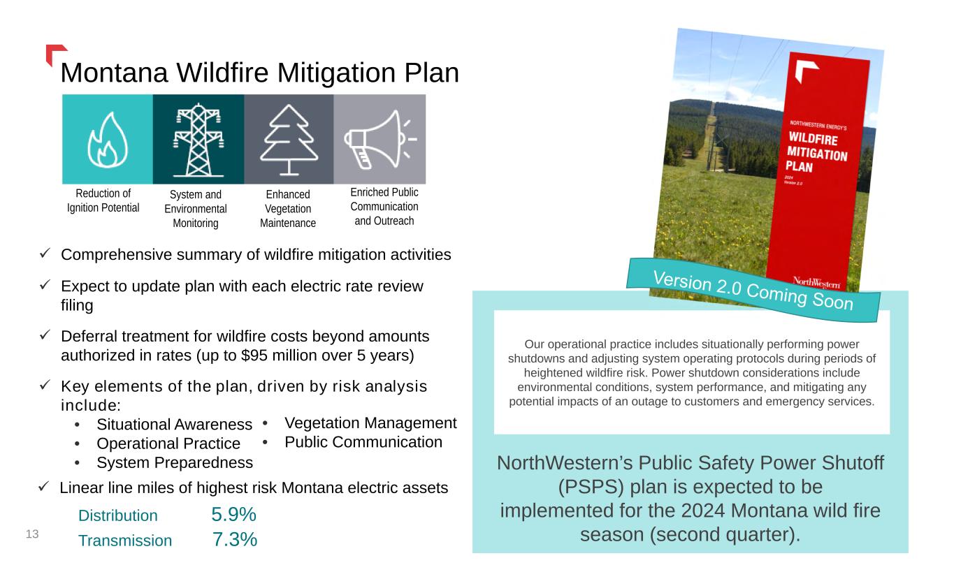 “Solid regulatory execution provided for quarter-over-earnings growth. New rates in Montana and South Dakota helped offset mild weather and a few one-time headwinds in the first quarter,” said Brian Bird, President and CEO. “We are affirming 2024 earnings guidance and remain on track to complete our $500 million capital plan, including the in-service of our 175 megawatt Yellowstone County Generating Station in Montana. Additionally, we expect to release our updated Wildfire Mitigation Plan soon which includes our new Public Safety Power Shutoff process. The plan recognizes and addresses the unique needs of our customers, communities and first responders.”