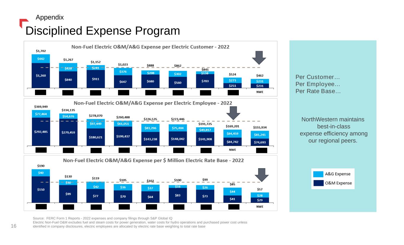 16 Disciplined Expense Program Source: FERC Form 1 Reports - 2022 expenses and company filings through S&P Global IQ Electric Non-Fuel O&M excludes fuel and steam costs for power generation, water costs for hydro operations and purchased power cost unless identified in company disclosures, electric employees are allocated by electric rate base weighting to total rate base Per Customer… Per Employee… Per Rate Base… NorthWestern maintains best-in-class expense efficiency among our regional peers. Appendix