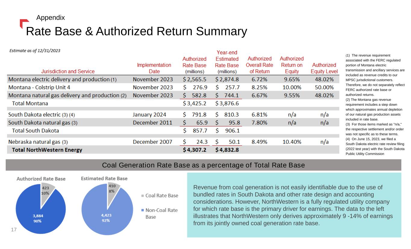 (1) The revenue requirement associated with the FERC regulated portion of Montana electric transmission and ancillary services are included as revenue credits to our MPSC jurisdictional customers. Therefore, we do not separately reflect FERC authorized rate base or authorized returns. (2) The Montana gas revenue requirement includes a step down which approximates annual depletion of our natural gas production assets included in rate base. (3) For those items marked as "n/a," the respective settlement and/or order was not specific as to these terms. (4) On June 15, 2023, we filed a South Dakota electric rate review filing (2022 test year) with the South Dakota Public Utility Commission Coal Generation Rate Base as a percentage of Total Rate Base Revenue from coal generation is not easily identifiable due to the use of bundled rates in South Dakota and other rate design and accounting considerations. However, NorthWestern is a fully regulated utility company for which rate base is the primary driver for earnings. The data to the left illustrates that NorthWestern only derives approximately 9 -14% of earnings from its jointly owned coal generation rate base. Rate Base & Authorized Return Summary Appendix 17