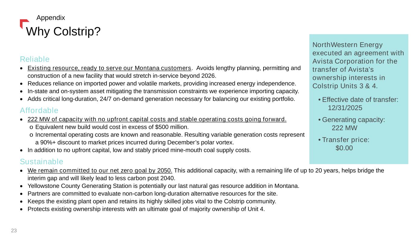 Why Colstrip? Reduces Risk We are in a supply capacity crisis due to lack of resource adequacy, with approx. 40% of our customers’ peak needs on the market. This transaction will reduce our need to import expensive capacity during critical times. Establishes clarity regarding operations past 2025 Washington state legislation deadline. Reduces PCCAM risk sharing for customers and shareholders. 24 Appendix Bill Headroom Stable pricing reduces impact of market volatility and high energy prices on customers. Aligned with ‘All of the Above’ energy transition in Montana Supports our generating portfolio that is nearly 60% carbon-free today. Provides future opportunity at the site while supporting economic development in Montana. Agreement considers the appropriate balance of reliability, affordability and sustainability.