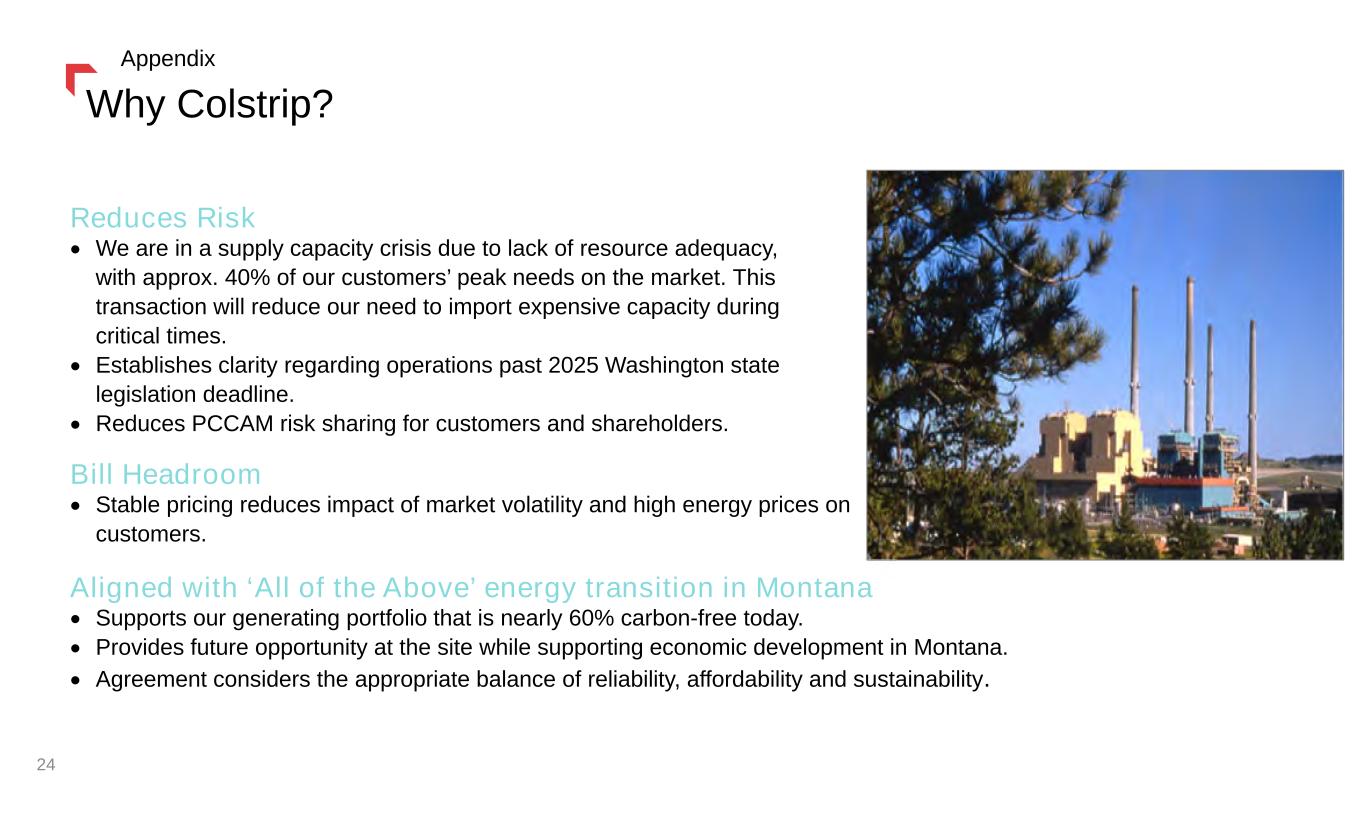 Why Colstrip? Reliable Existing resource, ready to serve our Montana customers. Avoids lengthy planning, permitting and construction of a new facility that would stretch in-service beyond 2026. Reduces reliance on imported power and volatile markets, providing increased energy independence. In-state and on-system asset mitigating the transmission constraints we experience importing capacity. Adds critical long-duration, 24/7 on-demand generation necessary for balancing our existing portfolio. Affordable 222 MW of capacity with no upfront capital costs and stable operating costs going forward. o Equivalent new build would cost in excess of $500 million. o Incremental operating costs are known and reasonable. Resulting variable generation costs represent a 90%+ discount to market prices incurred during December’s polar vortex. In addition to no upfront capital, low and stably priced mine-mouth coal supply costs. Sustainable We remain committed to our net zero goal by 2050. This additional capacity, with a remaining life of up to 20 years, helps bridge the interim gap and will likely lead to less carbon post 2040. Yellowstone County Generating Station is potentially our last natural gas resource addition in Montana. Partners are committed to evaluate non-carbon long-duration alternative resources for the site. Keeps the existing plant open and retains its highly skilled jobs vital to the Colstrip community. Protects existing ownership interests with an ultimate goal of majority ownership of Unit 4. NorthWestern Energy executed an agreement with Avista Corporation for the transfer of Avista’s ownership interests in Colstrip Units 3 & 4. • Effective date of transfer: 12/31/2025 • Generating capacity: 222 MW • Transfer price: $0.00 23 Appendix