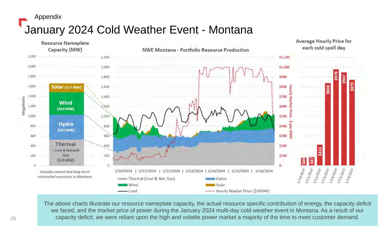 25 Appendix January 2024 Cold Weather Event - Montana The above charts illustrate our resource nameplate capacity, the actual resource specific contribution of energy, the capacity deficit we faced, and the market price of power during the January 2024 multi-day cold weather event in Montana. As a result of our capacity deficit, we were reliant upon the high and volatile power market a majority of the time to meet customer demand.
