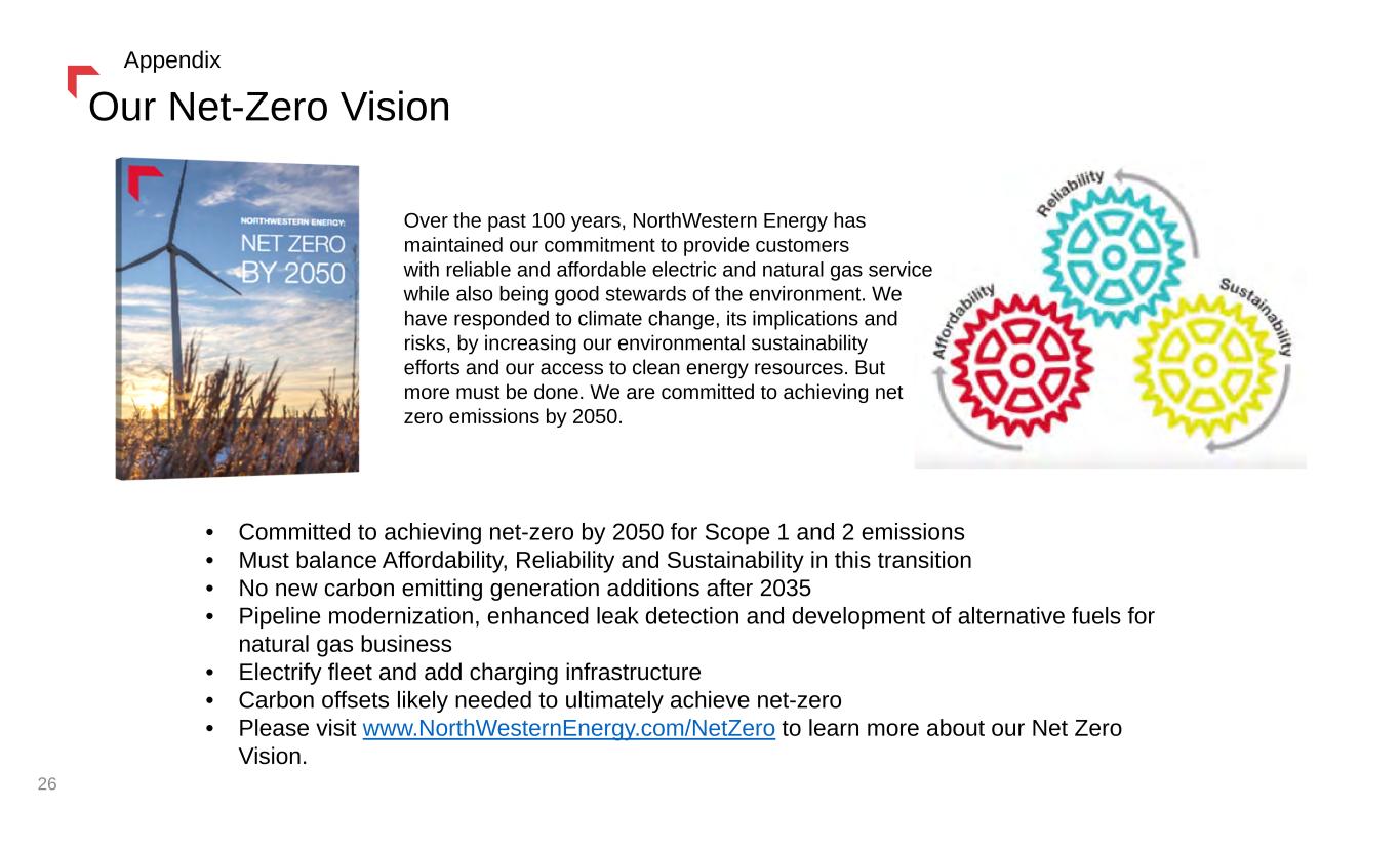Our Net-Zero Vision Over the past 100 years, NorthWestern Energy has maintained our commitment to provide customers with reliable and affordable electric and natural gas service while also being good stewards of the environment. We have responded to climate change, its implications and risks, by increasing our environmental sustainability efforts and our access to clean energy resources. But more must be done. We are committed to achieving net zero emissions by 2050. • Committed to achieving net-zero by 2050 for Scope 1 and 2 emissions • Must balance Affordability, Reliability and Sustainability in this transition • No new carbon emitting generation additions after 2035 • Pipeline modernization, enhanced leak detection and development of alternative fuels for natural gas business • Electrify fleet and add charging infrastructure • Carbon offsets likely needed to ultimately achieve net-zero • Please visit www.NorthWesternEnergy.com/NetZero to learn more about our Net Zero Vision. 26 Appendix