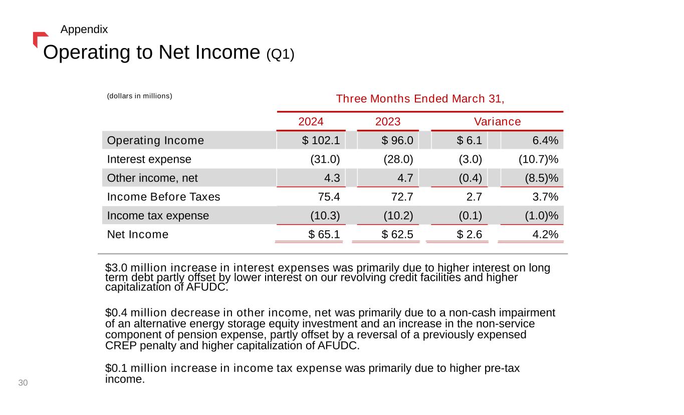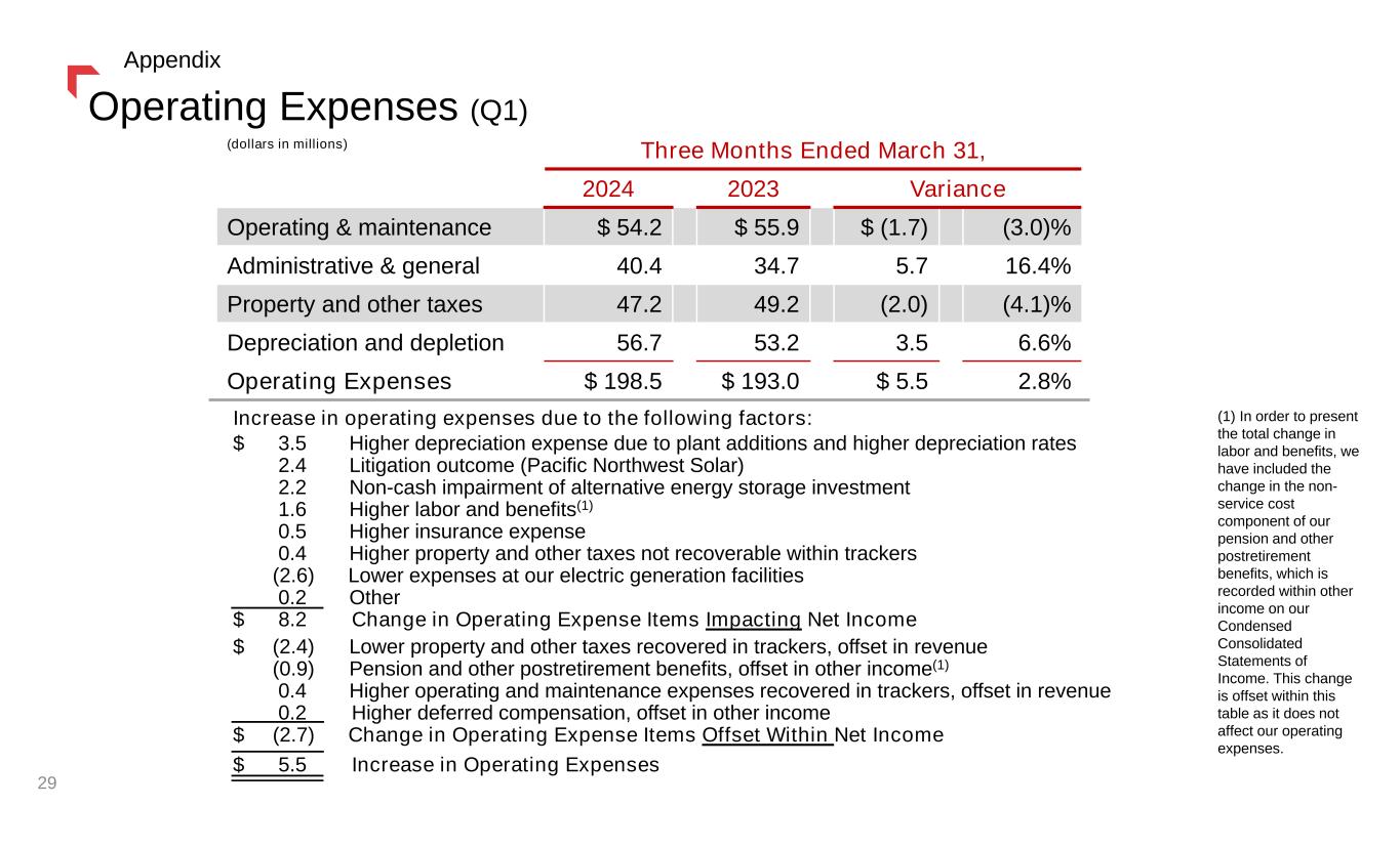 Operating Expenses (Q1) Increase in operating expenses due to the following factors: $ 3.5 Higher depreciation expense due to plant additions and higher depreciation rates 2.4 Litigation outcome (Pacific Northwest Solar) 2.2 Non-cash impairment of alternative energy storage investment 1.6 Higher labor and benefits(1) 0.5 Higher insurance expense 0.4 Higher property and other taxes not recoverable within trackers (2.6) Lower expenses at our electric generation facilities 0.2 Other $ 8.2 Change in Operating Expense Items Impacting Net Income (dollars in millions) Three Months Ended March 31, 2024 2023 Variance Operating & maintenance $ 54.2 $ 55.9 $ (1.7) (3.0)% Administrative & general 40.4 34.7 5.7 16.4% Property and other taxes 47.2 49.2 (2.0) (4.1)% Depreciation and depletion 56.7 53.2 3.5 6.6% Operating Expenses $ 198.5 $ 193.0 $ 5.5 2.8% $ (2.4) Lower property and other taxes recovered in trackers, offset in revenue (0.9) Pension and other postretirement benefits, offset in other income(1) 0.4 Higher operating and maintenance expenses recovered in trackers, offset in revenue 0.2 Higher deferred compensation, offset in other income $ (2.7) Change in Operating Expense Items Offset Within Net Income $ 5.5 Increase in Operating Expenses (1) In order to present the total change in labor and benefits, we have included the change in the non- service cost component of our pension and other postretirement benefits, which is recorded within other income on our Condensed Consolidated Statements of Income. This change is offset within this table as it does not affect our operating expenses. 29 Appendix