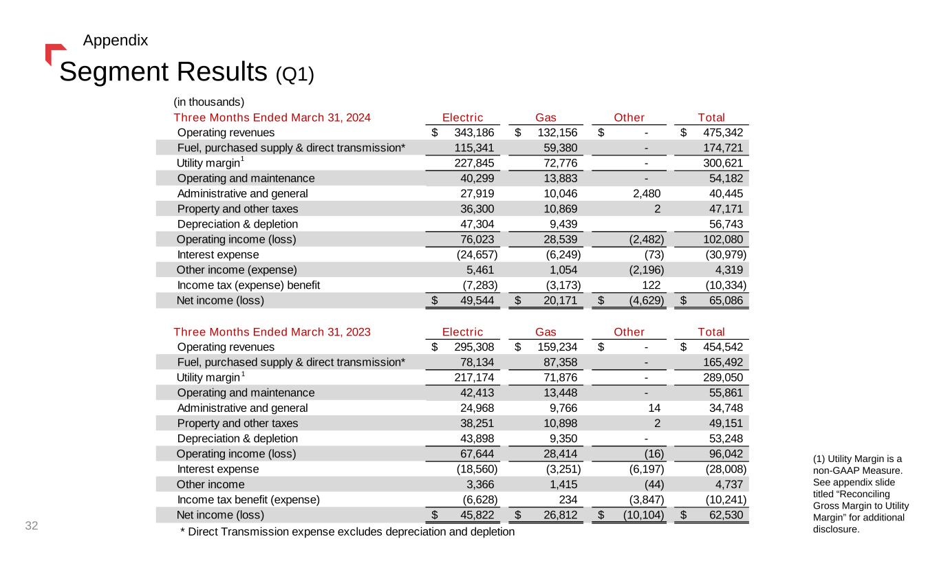 Segment Results (Q1) (1) Utility Margin is a non-GAAP Measure. See appendix slide titled “Reconciling Gross Margin to Utility Margin” for additional disclosure. 32 Appendix Three Months Ended March 31, 2024 Electric Gas Other Total Operating revenues 343,186$ 132,156$ -$ 475,342$ Fuel, purchased supply & direct transmission* 115,341 59,380 - 174,721 Utility margin 227,845 72,776 - 300,621 Operating and maintenance 40,299 13,883 - 54,182 Administrative and general 27,919 10,046 2,480 40,445 Property and other taxes 36,300 10,869 2 47,171 Depreciation & depletion 47,304 9,439 56,743 Operating income (loss) 76,023 28,539 (2,482) 102,080 Interest expense (24,657) (6,249) (73) (30,979) Other income (expense) 5,461 1,054 (2,196) 4,319 Income tax (expense) benefit (7,283) (3,173) 122 (10,334) Net income (loss) 49,544$ 20,171$ (4,629)$ 65,086$ Three Months Ended March 31, 2023 Electric Gas Other Total Operating revenues 295,308$ 159,234$ -$ 454,542$ Fuel, purchased supply & direct transmission* 78,134 87,358 - 165,492 Utility margin 217,174 71,876 - 289,050 Operating and maintenance 42,413 13,448 - 55,861 Administrative and general 24,968 9,766 14 34,748 Property and other taxes 38,251 10,898 2 49,151 Depreciation & depletion 43,898 9,350 - 53,248 Operating income (loss) 67,644 28,414 (16) 96,042 Interest expense (18,560) (3,251) (6,197) (28,008) Other income 3,366 1,415 (44) 4,737 Income tax benefit (expense) (6,628) 234 (3,847) (10,241) Net income (loss) 45,822$ 26,812$ (10,104)$ 62,530$ * Direct Transmission expense excludes depreciation and depletion (in thousands) 1 1
