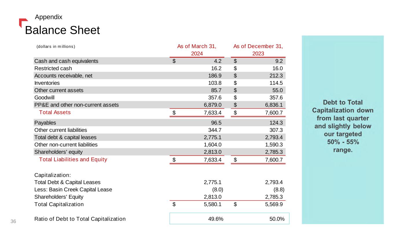 (dollars in millions) As of March 31, As of December 31, 2024 2023 Cash and cash equivalents 4.2$ 9.2$ Restricted cash 16.2 16.0$ Accounts receivable, net 186.9 212.3$ Inventories 103.8 114.5$ Other current assets 85.7 55.0$ Goodwill 357.6 357.6$ PP&E and other non-current assets 6,879.0 6,836.1$ Total Assets 7,633.4$ 7,600.7$ Payables 96.5 124.3 Other current liabilities 344.7 307.3 Total debt & capital leases 2,775.1 2,793.4 Other non-current liabilities 1,604.0 1,590.3 Shareholders' equity 2,813.0 2,785.3 Total Liabilities and Equity 7,633.4$ 7,600.7$ Capitalization: Total Debt & Capital Leases 2,775.1 2,793.4 Less: Basin Creek Capital Lease (8.0) (8.8) Shareholders' Equity 2,813.0 2,785.3 Total Capitalization 5,580.1$ 5,569.9$ Ratio of Debt to Total Capitalization 49.6% 50.0% Balance Sheet 36 Appendix