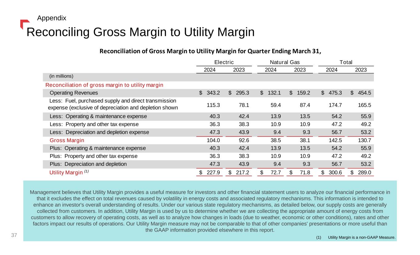 Reconciling Gross Margin to Utility Margin Management believes that Utility Margin provides a useful measure for investors and other financial statement users to analyze our financial performance in that it excludes the effect on total revenues caused by volatility in energy costs and associated regulatory mechanisms. This information is intended to enhance an investor's overall understanding of results. Under our various state regulatory mechanisms, as detailed below, our supply costs are generally collected from customers. In addition, Utility Margin is used by us to determine whether we are collecting the appropriate amount of energy costs from customers to allow recovery of operating costs, as well as to analyze how changes in loads (due to weather, economic or other conditions), rates and other factors impact our results of operations. Our Utility Margin measure may not be comparable to that of other companies' presentations or more useful than the GAAP information provided elsewhere in this report. (1) Utility Margin is a non-GAAP Measure. 37 Appendix 2024 2023 2024 2023 2024 2023 (in millions) Reconciliation of gross margin to utility margin Operating Revenues 343.2$ 295.3$ 132.1$ 159.2$ 475.3$ 454.5$ Less: Fuel, purchased supply and direct transmission expense (exclusive of depreciation and depletion shown l b l ) 115.3 78.1 59.4 87.4 174.7 165.5 Less: Operating & maintenance expense 40.3 42.4 13.9 13.5 54.2 55.9 Less: Property and other tax expense 36.3 38.3 10.9 10.9 47.2 49.2 Less: Depreciation and depletion expense 47.3 43.9 9.4 9.3 56.7 53.2 Gross Margin 104.0 92.6 38.5 38.1 142.5 130.7 Plus: Operating & maintenance expense 40.3 42.4 13.9 13.5 54.2 55.9 Plus: Property and other tax expense 36.3 38.3 10.9 10.9 47.2 49.2 Plus: Depreciation and depletion 47.3 43.9 9.4 9.3 56.7 53.2 Utility Margin 227.9$ 217.2$ 72.7$ 71.8$ 300.6$ 289.0$ Reconciliation of Gross Margin to Utility Margin for Quarter Ending March 31, Electric Natural Gas Total (1)