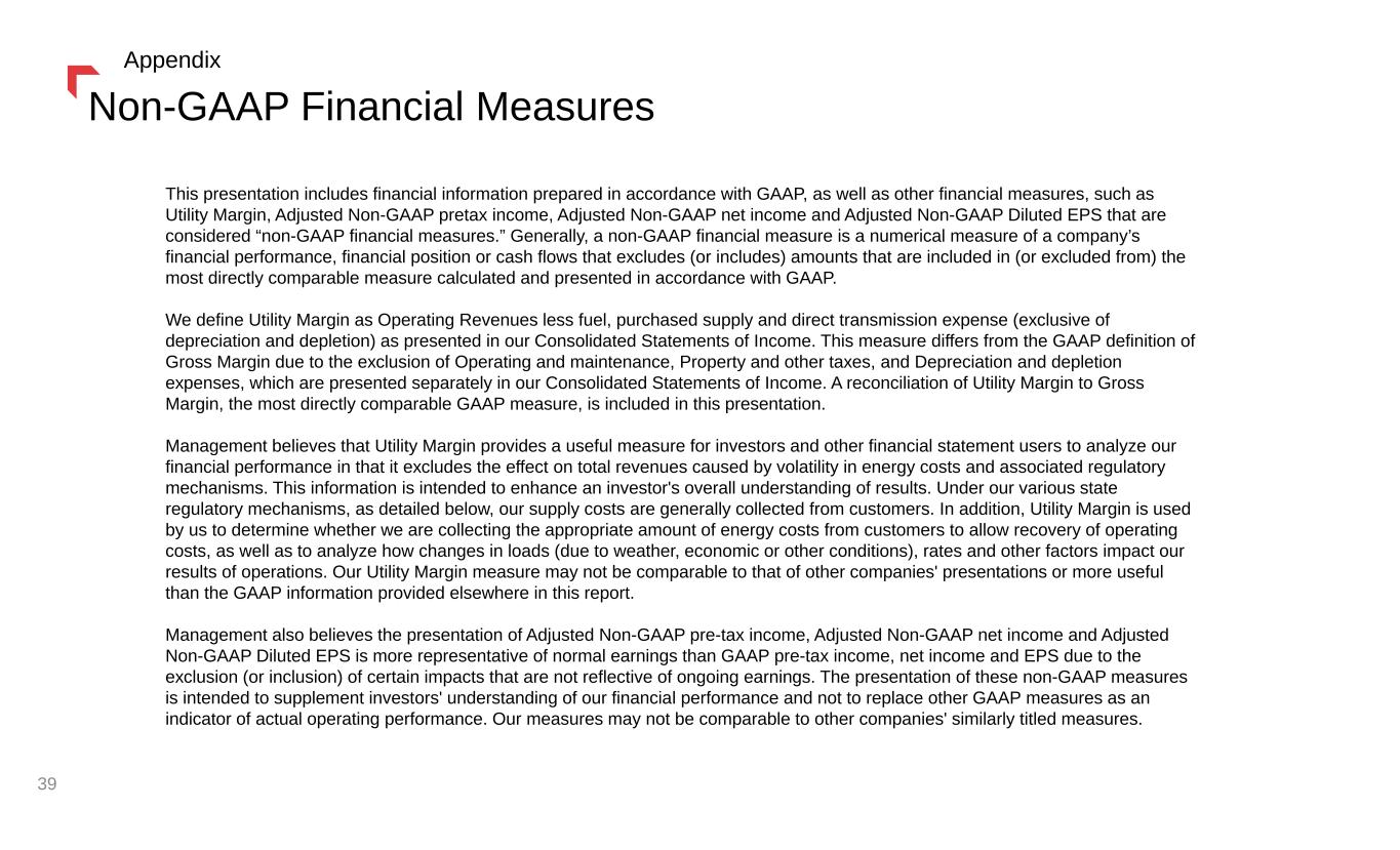 Non-GAAP Financial Measures This presentation includes financial information prepared in accordance with GAAP, as well as other financial measures, such as Utility Margin, Adjusted Non-GAAP pretax income, Adjusted Non-GAAP net income and Adjusted Non-GAAP Diluted EPS that are considered “non-GAAP financial measures.” Generally, a non-GAAP financial measure is a numerical measure of a company’s financial performance, financial position or cash flows that excludes (or includes) amounts that are included in (or excluded from) the most directly comparable measure calculated and presented in accordance with GAAP. We define Utility Margin as Operating Revenues less fuel, purchased supply and direct transmission expense (exclusive of depreciation and depletion) as presented in our Consolidated Statements of Income. This measure differs from the GAAP definition of Gross Margin due to the exclusion of Operating and maintenance, Property and other taxes, and Depreciation and depletion expenses, which are presented separately in our Consolidated Statements of Income. A reconciliation of Utility Margin to Gross Margin, the most directly comparable GAAP measure, is included in this presentation. Management believes that Utility Margin provides a useful measure for investors and other financial statement users to analyze our financial performance in that it excludes the effect on total revenues caused by volatility in energy costs and associated regulatory mechanisms. This information is intended to enhance an investor's overall understanding of results. Under our various state regulatory mechanisms, as detailed below, our supply costs are generally collected from customers. In addition, Utility Margin is used by us to determine whether we are collecting the appropriate amount of energy costs from customers to allow recovery of operating costs, as well as to analyze how changes in loads (due to weather, economic or other conditions), rates and other factors impact our results of operations. Our Utility Margin measure may not be comparable to that of other companies' presentations or more useful than the GAAP information provided elsewhere in this report. Management also believes the presentation of Adjusted Non-GAAP pre-tax income, Adjusted Non-GAAP net income and Adjusted Non-GAAP Diluted EPS is more representative of normal earnings than GAAP pre-tax income, net income and EPS due to the exclusion (or inclusion) of certain impacts that are not reflective of ongoing earnings. The presentation of these non-GAAP measures is intended to supplement investors' understanding of our financial performance and not to replace other GAAP measures as an indicator of actual operating performance. Our measures may not be comparable to other companies' similarly titled measures. 39 Appendix
