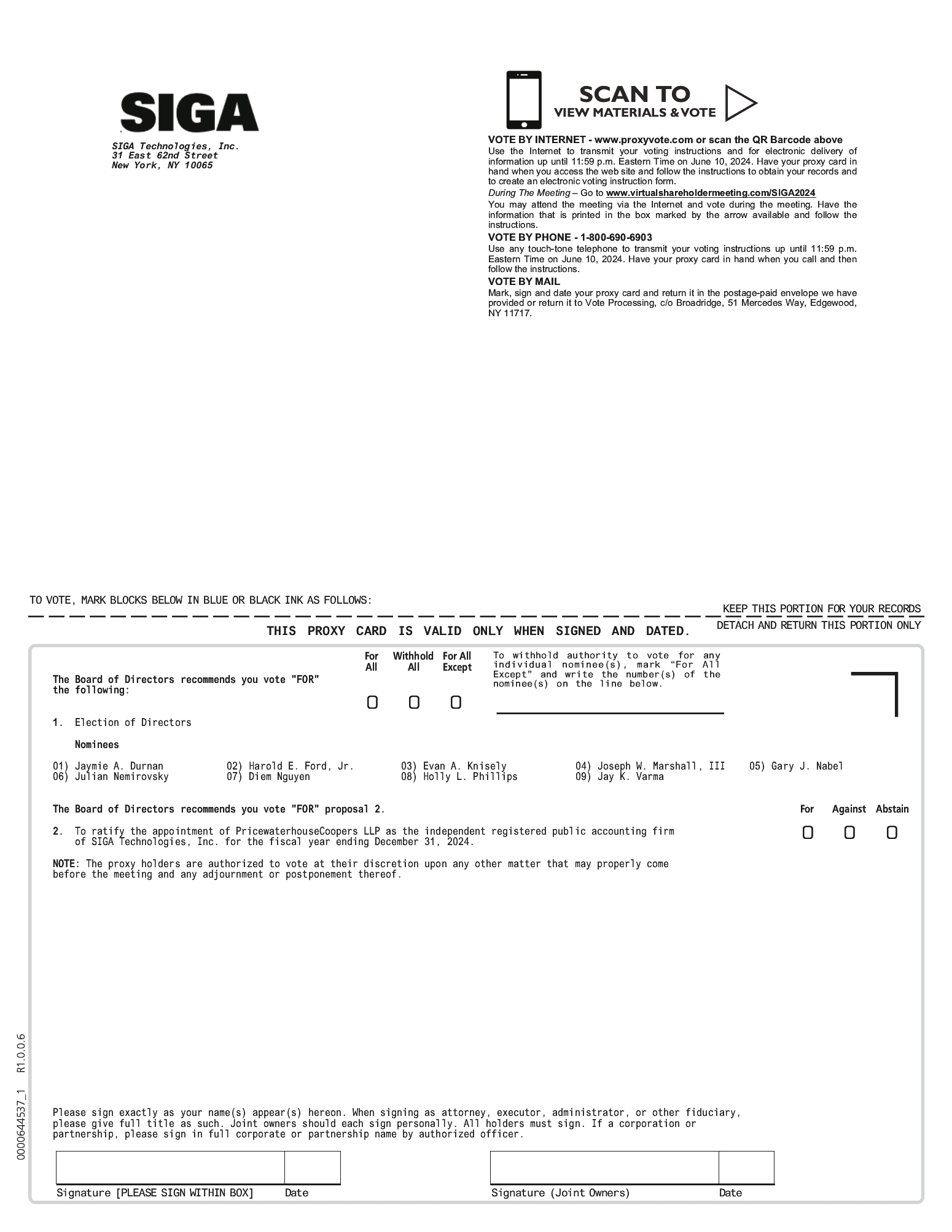 2. | To ratify the appointment of PricewaterhouseCoopers LLP as the independent registered public accounting firm of SIGA for the fiscal year ending December 31, 2024; and |