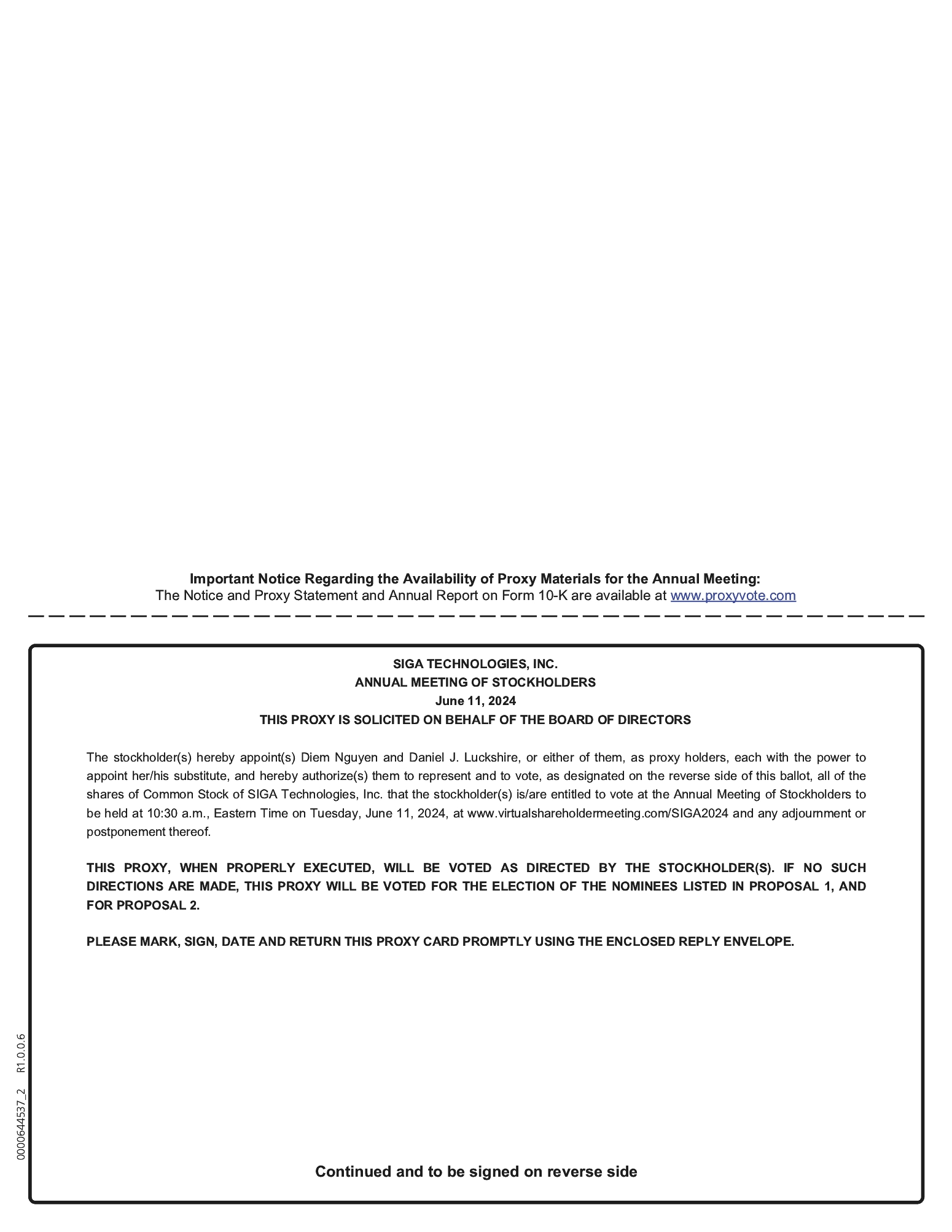 1. | writing a letter delivered to Daniel J. Luckshire, Secretary of SIGA, stating that the proxy is revoked; |