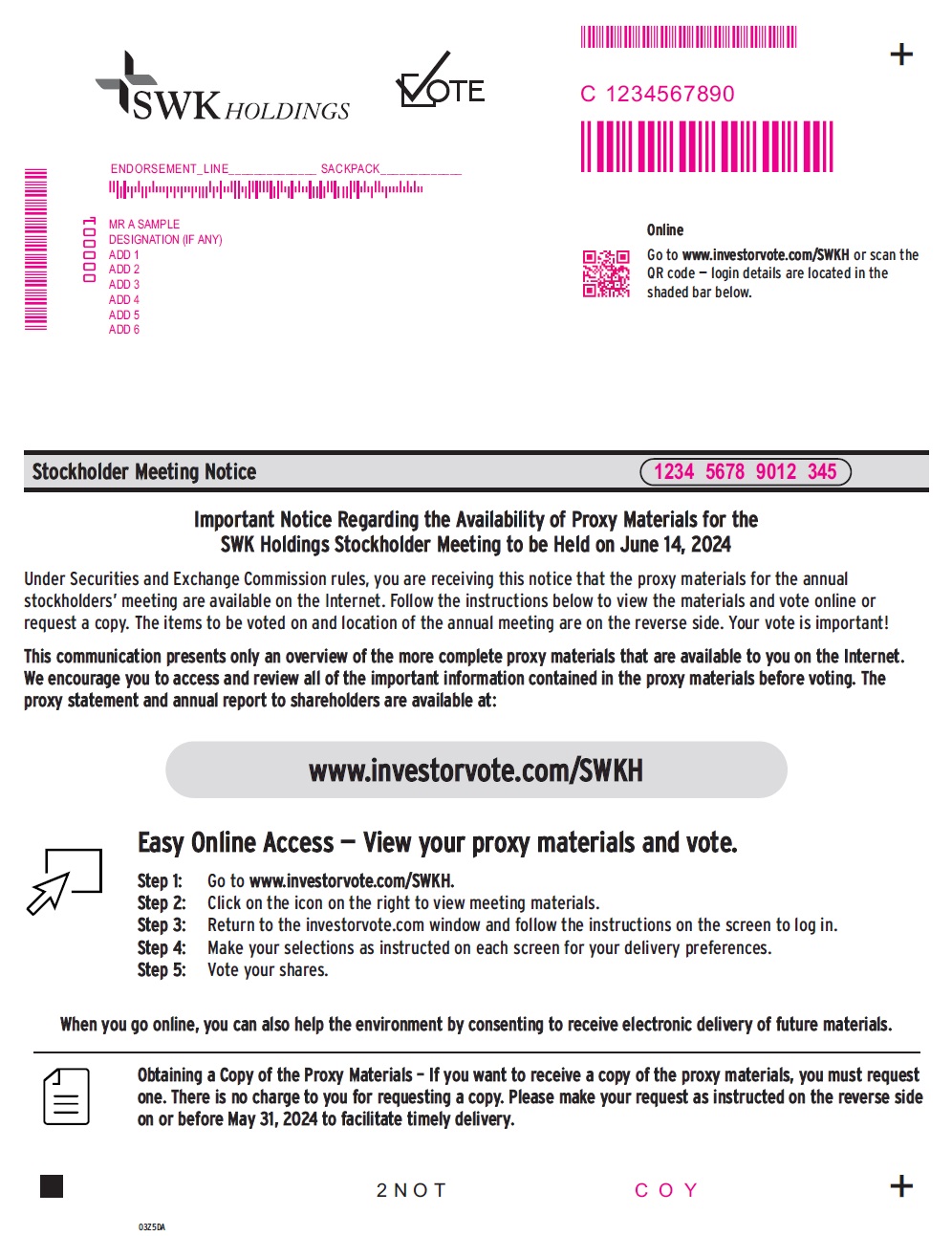 www.investorvote.com/SWKH Step 1: Go to www.investorvote.com/SWKH. Step 2: Click on the icon on the right to view meeting materials. Step 3: Return to the investorvote.com window and follow the instructions on the screen to log in. Online Go to www.investorvote.com/SWKH or scan the QR code — login details are located in the shaded bar below. Stockholder Meeting Notice 03Z5DA + + Important Notice Regarding the Availability of Proxy Materials for the SWK Holdings Stockholder Meeting to be Held on June 14, 2024 Under Securities and Exchange Commission rules, you are receiving this notice that the proxy materials for the annual stockholders’ meeting are available on the Internet. Follow the instructions below to view the materials and vote online or request a copy. The items to be voted on and location of the annual meeting are on the reverse side. Your vote is important! This communication presents only an overview of the more complete proxy materials that are available to you on the Internet. We encourage you to access and review all of the important information contained in the proxy materials before voting. The proxy statement and annual report to shareholders are available at: Obtaining a Copy of the Proxy Materials – If you want to receive a copy of the proxy materials, you must request one. There is no charge to you for requesting a copy. Please make your request as instructed on the reverse side on or before May 31, 2024 to facilitate timely delivery. 2 N O T Easy Online Access — View your proxy materials and vote. When you go online, you can also help the environment by consenting to receive electronic delivery of future materials. Step 4: Make your selections as instructed on each screen for your delivery preferences. Step 5: Vote your shares. MMMMMMMMMMMM MMMMMMMMM MR A SAMPLE DESIGNATION (IF ANY) ADD 1 ADD 2 ADD 3 ADD 4 ADD 5 ADD 6 ENDORSEMENT_LINE______________ SACKPACK_____________ 1234 5678 9012 345 C 1234567890 C O Y MMMMMMM 000001