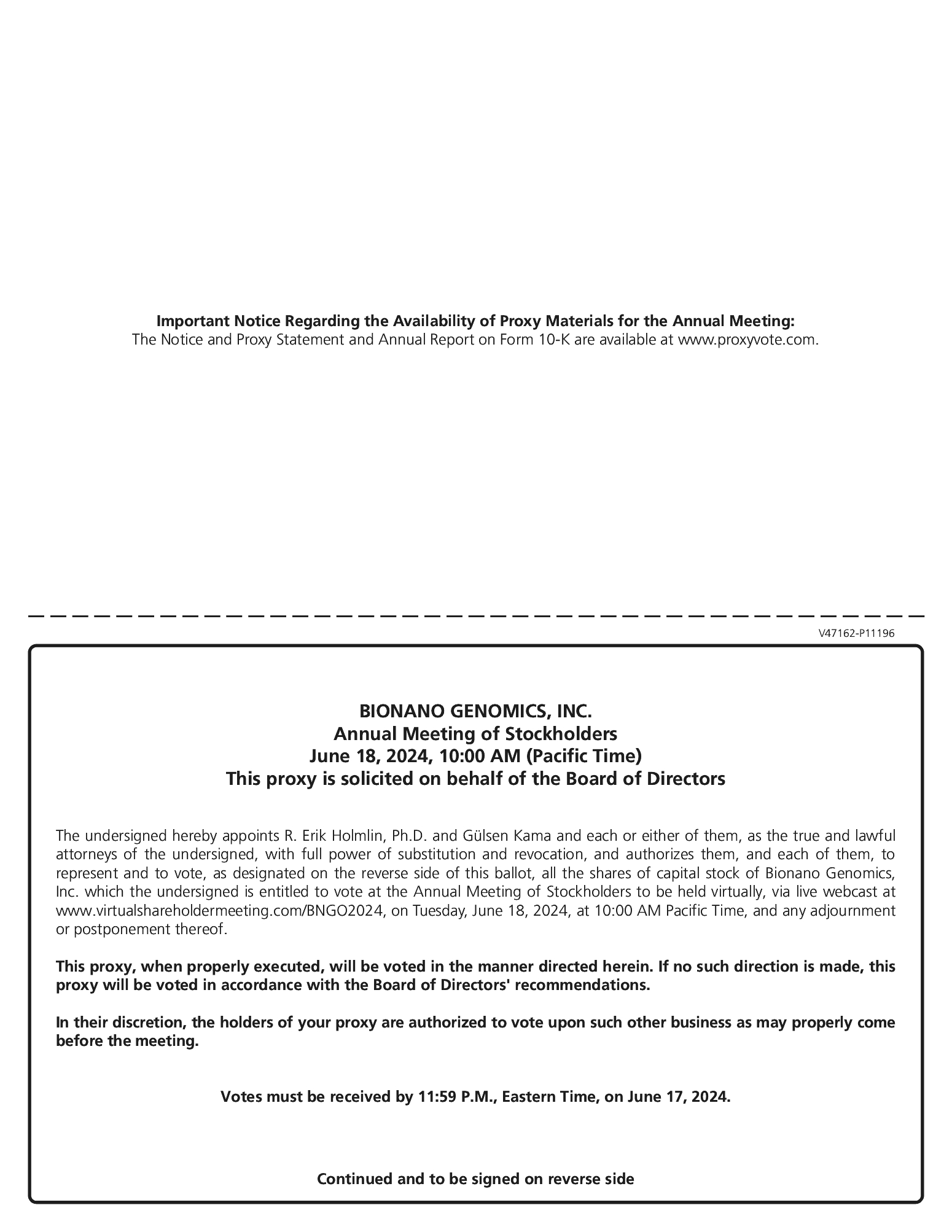 • | Any stockholder may listen to the Annual Meeting via audio webcast at www.virtualshareholdermeeting.com/BNGO2024. The webcast will begin at 10:00 a.m. Pacific Time. |