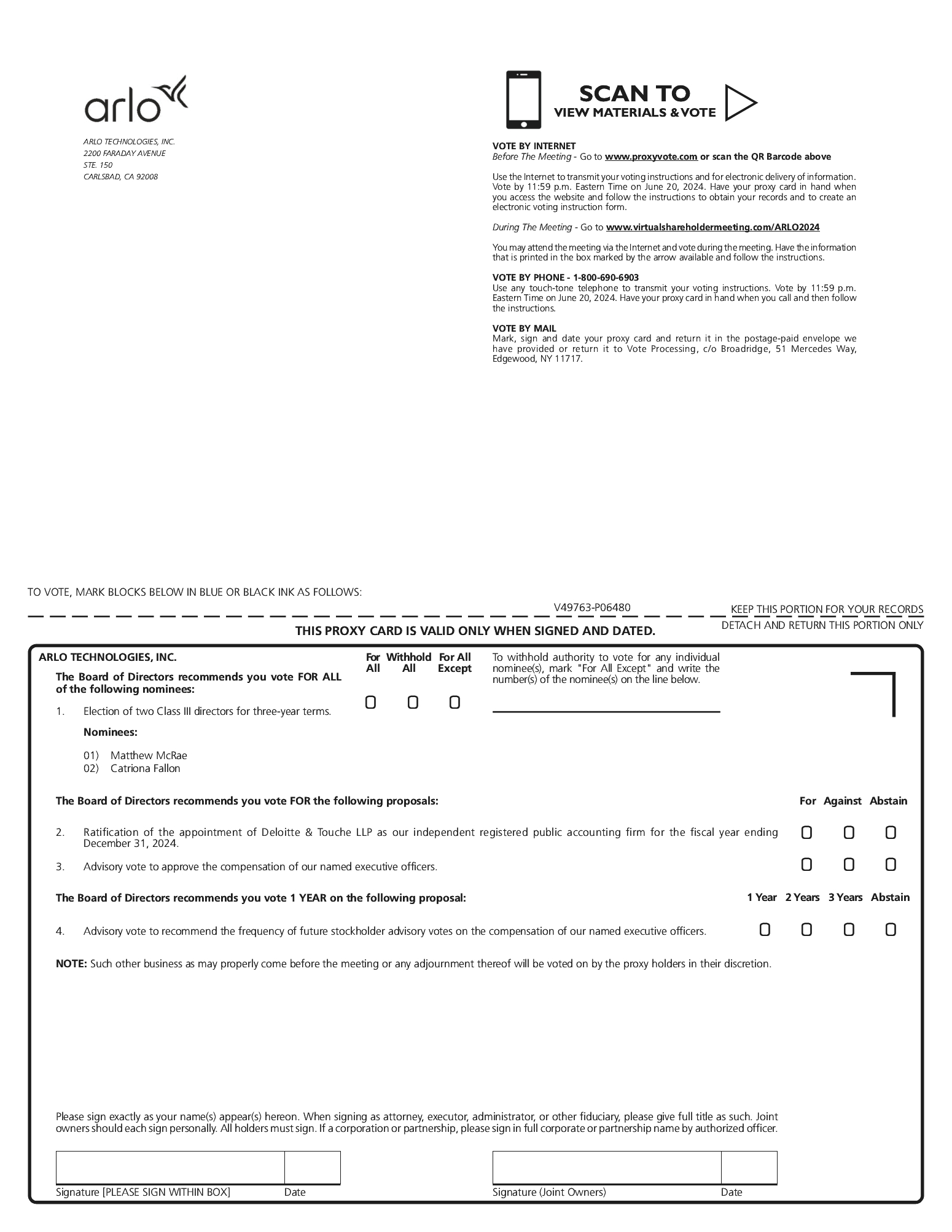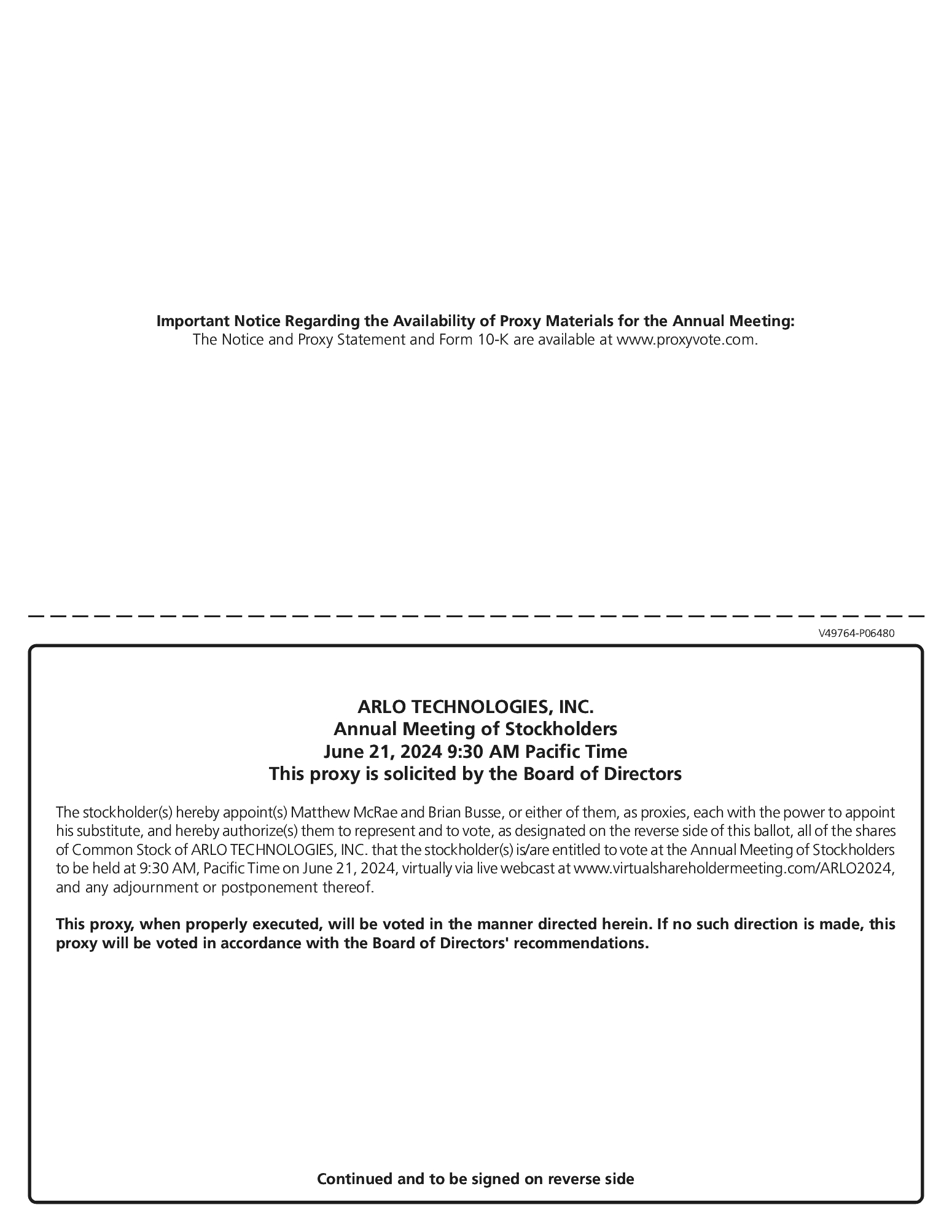 Pursuant to rules adopted by the SEC, we have elected to provide access to our proxy materials over the internet. Accordingly, we have sent you a Notice because the Board of Arlo Technologies, Inc. is soliciting your proxy to vote at the 2024 Annual Meeting, including at any adjournments or postponements of the meeting. All stockholders will have the ability to access the proxy materials on the website referred to in the Notice or request to receive a printed set of the proxy materials. Instructions on how to access the proxy materials over the internet or to request a printed copy may be found in the Notice. You are invited to virtually attend the Annual Meeting to vote on the proposals described in this proxy statement. The Annual Meeting will be held virtually on June 21, 2024, at 9:30 a.m., Pacific Time. You can attend the Annual Meeting online by visiting http://www.virtualshareholdermeeting.com/ARLO2024, where you will be able to listen to the meeting live, submit questions and vote online. However, you do not need to attend the meeting to vote your shares. Instead, you may simply complete, sign and return your proxy card that you may request or that we may elect to deliver at a later time or follow the instructions below to submit your proxy over the telephone or through the internet. |