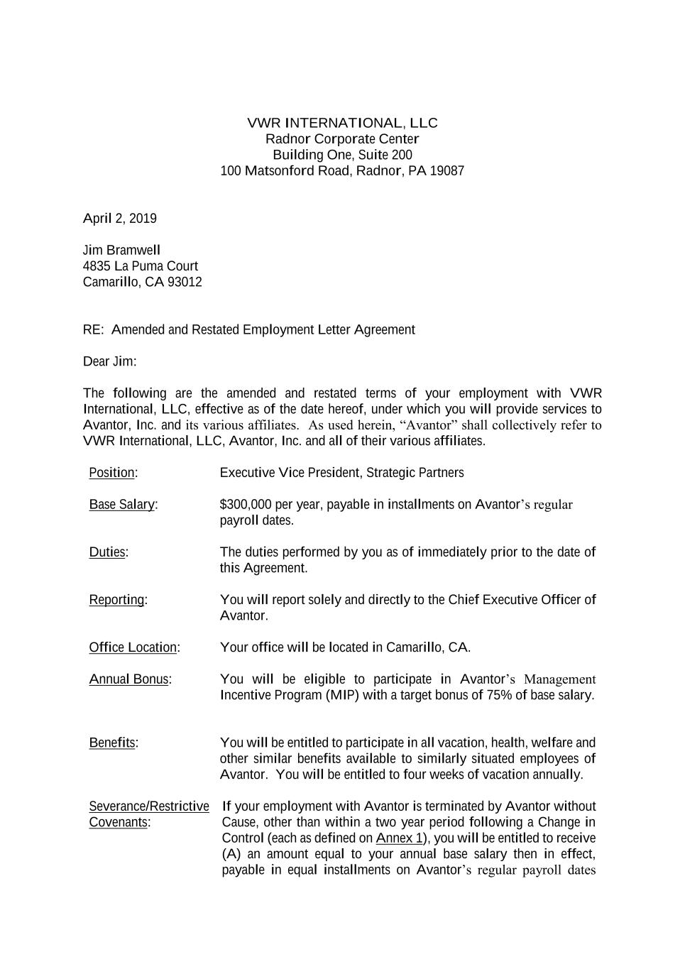 VWR INTERNATIONAL, LLC Radnor Corporate Center Building One, Suite 200 100 Matsonford Road, Radnor, PA 19087 April 2, 2019 Jim Bramwell 4835 La Puma Court Camarillo, CA 93012 RE: Amended and Restated Employment Letter Agreement Dear Jim: The following are the amended and restated terms of your employment with VWR International, LLC, effective as of the date hereof, under which you will provide services to Avantor, Inc. and its various affiliates. As used herein, “Avantor” shall collectively refer to VWR International, LLC, Avantor, Inc. and all of their various affiliates. Position: Executive Vice President, Strategic Partners Base Salary: $300,000 per year, payable in installments on Avantor’s regular payroll dates. Duties: The duties performed by you as of immediately prior to the date of this Agreement. Reporting: You will report solely and directly to the Chief Executive Officer of Avantor. Office Location: Your office will be located in Camarillo, CA. Annual Bonus: You will be eligible to participate in Avantor’s Management Incentive Program (MIP) with a target bonus of 75% of base salary. Benefits: You will be entitled to participate in all vacation, health, welfare and other similar benefits available to similarly situated employees of Avantor. You will be entitled to four weeks of vacation annually. Severance/Restrictive Covenants: If your employment with Avantor is terminated by Avantor without Cause, other than within a two year period following a Change in Control (each as defined on Annex 1), you will be entitled to receive (A) an amount equal to your annual base salary then in effect, payable in equal installments on Avantor’s regular payroll dates