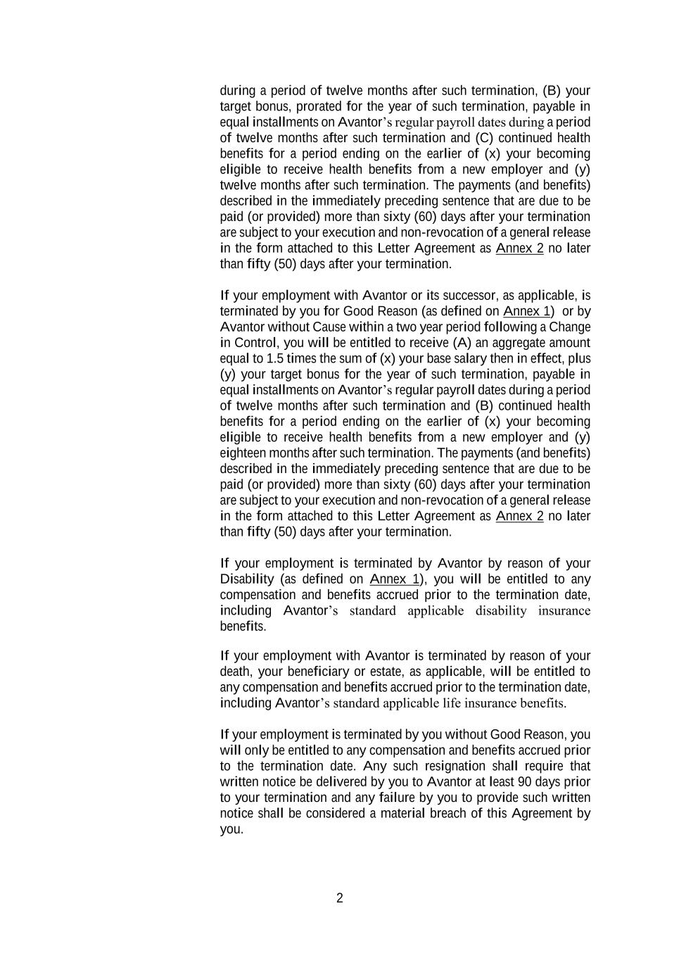 2 during a period of twelve months after such termination, (B) your target bonus, prorated for the year of such termination, payable in equal installments on Avantor’s regular payroll dates during a period of twelve months after such termination and (C) continued health benefits for a period ending on the earlier of (x) your becoming eligible to receive health benefits from a new employer and (y) twelve months after such termination. The payments (and benefits) described in the immediately preceding sentence that are due to be paid (or provided) more than sixty (60) days after your termination are subject to your execution and non-revocation of a general release in the form attached to this Letter Agreement as Annex 2 no later than fifty (50) days after your termination. If your employment with Avantor or its successor, as applicable, is terminated by you for Good Reason (as defined on Annex 1) or by Avantor without Cause within a two year period following a Change in Control, you will be entitled to receive (A) an aggregate amount equal to 1.5 times the sum of (x) your base salary then in effect, plus (y) your target bonus for the year of such termination, payable in equal installments on Avantor’s regular payroll dates during a period of twelve months after such termination and (B) continued health benefits for a period ending on the earlier of (x) your becoming eligible to receive health benefits from a new employer and (y) eighteen months after such termination. The payments (and benefits) described in the immediately preceding sentence that are due to be paid (or provided) more than sixty (60) days after your termination are subject to your execution and non-revocation of a general release in the form attached to this Letter Agreement as Annex 2 no later than fifty (50) days after your termination. If your employment is terminated by Avantor by reason of your Disability (as defined on Annex 1), you will be entitled to any compensation and benefits accrued prior to the termination date, including Avantor’s standard applicable disability insurance benefits. If your employment with Avantor is terminated by reason of your death, your beneficiary or estate, as applicable, will be entitled to any compensation and benefits accrued prior to the termination date, including Avantor’s standard applicable life insurance benefits. If your employment is terminated by you without Good Reason, you will only be entitled to any compensation and benefits accrued prior to the termination date. Any such resignation shall require that written notice be delivered by you to Avantor at least 90 days prior to your termination and any failure by you to provide such written notice shall be considered a material breach of this Agreement by you.