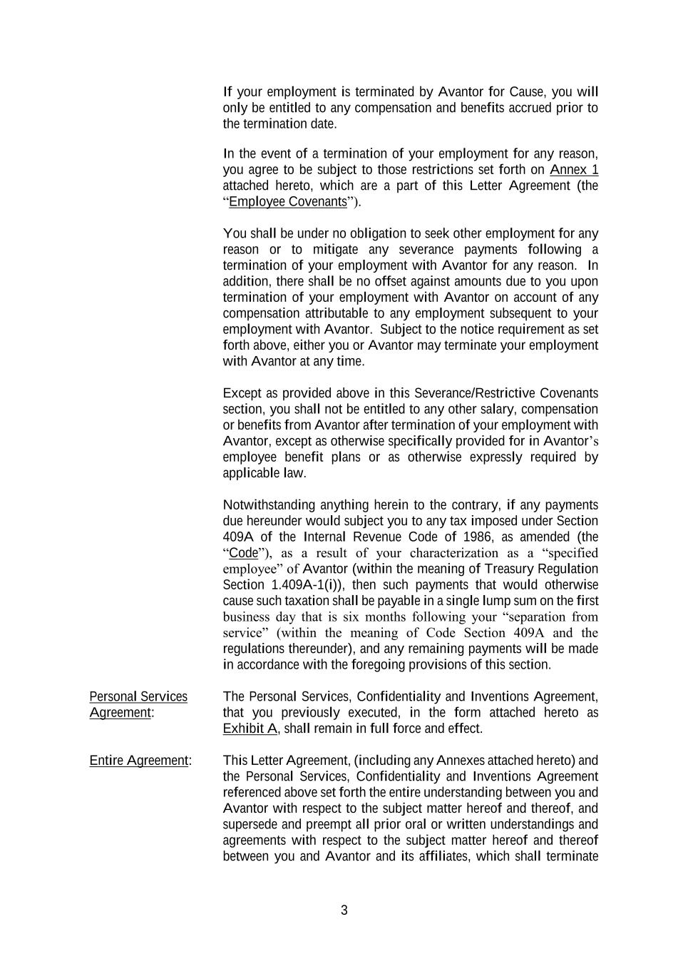 3 If your employment is terminated by Avantor for Cause, you will only be entitled to any compensation and benefits accrued prior to the termination date. In the event of a termination of your employment for any reason, you agree to be subject to those restrictions set forth on Annex 1 attached hereto, which are a part of this Letter Agreement (the “Employee Covenants”). You shall be under no obligation to seek other employment for any reason or to mitigate any severance payments following a termination of your employment with Avantor for any reason. In addition, there shall be no offset against amounts due to you upon termination of your employment with Avantor on account of any compensation attributable to any employment subsequent to your employment with Avantor. Subject to the notice requirement as set forth above, either you or Avantor may terminate your employment with Avantor at any time. Except as provided above in this Severance/Restrictive Covenants section, you shall not be entitled to any other salary, compensation or benefits from Avantor after termination of your employment with Avantor, except as otherwise specifically provided for in Avantor’s employee benefit plans or as otherwise expressly required by applicable law. Notwithstanding anything herein to the contrary, if any payments due hereunder would subject you to any tax imposed under Section 409A of the Internal Revenue Code of 1986, as amended (the “Code”), as a result of your characterization as a “specified employee” of Avantor (within the meaning of Treasury Regulation Section 1.409A-1(i)), then such payments that would otherwise cause such taxation shall be payable in a single lump sum on the first business day that is six months following your “separation from service” (within the meaning of Code Section 409A and the regulations thereunder), and any remaining payments will be made in accordance with the foregoing provisions of this section. Personal Services Agreement: The Personal Services, Confidentiality and Inventions Agreement, that you previously executed, in the form attached hereto as Exhibit A, shall remain in full force and effect. Entire Agreement: This Letter Agreement, (including any Annexes attached hereto) and the Personal Services, Confidentiality and Inventions Agreement referenced above set forth the entire understanding between you and Avantor with respect to the subject matter hereof and thereof, and supersede and preempt all prior oral or written understandings and agreements with respect to the subject matter hereof and thereof between you and Avantor and its affiliates, which shall terminate