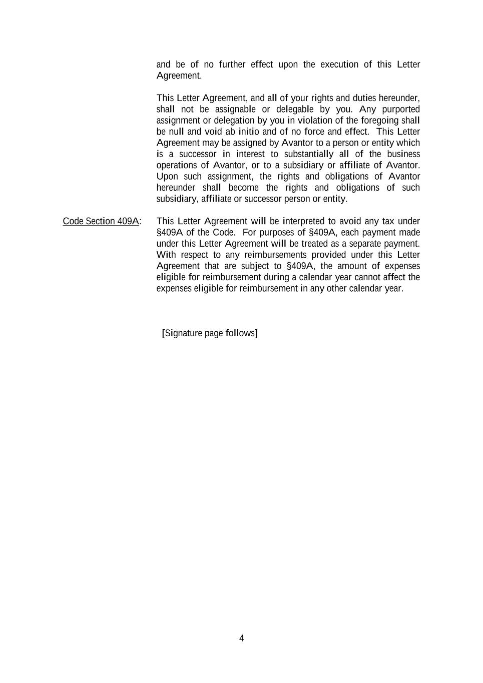4 and be of no further effect upon the execution of this Letter Agreement. This Letter Agreement, and all of your rights and duties hereunder, shall not be assignable or delegable by you. Any purported assignment or delegation by you in violation of the foregoing shall be null and void ab initio and of no force and effect. This Letter Agreement may be assigned by Avantor to a person or entity which is a successor in interest to substantially all of the business operations of Avantor, or to a subsidiary or affiliate of Avantor. Upon such assignment, the rights and obligations of Avantor hereunder shall become the rights and obligations of such subsidiary, affiliate or successor person or entity. Code Section 409A: This Letter Agreement will be interpreted to avoid any tax under §409A of the Code. For purposes of §409A, each payment made under this Letter Agreement will be treated as a separate payment. With respect to any reimbursements provided under this Letter Agreement that are subject to §409A, the amount of expenses eligible for reimbursement during a calendar year cannot affect the expenses eligible for reimbursement in any other calendar year. [Signature page follows]