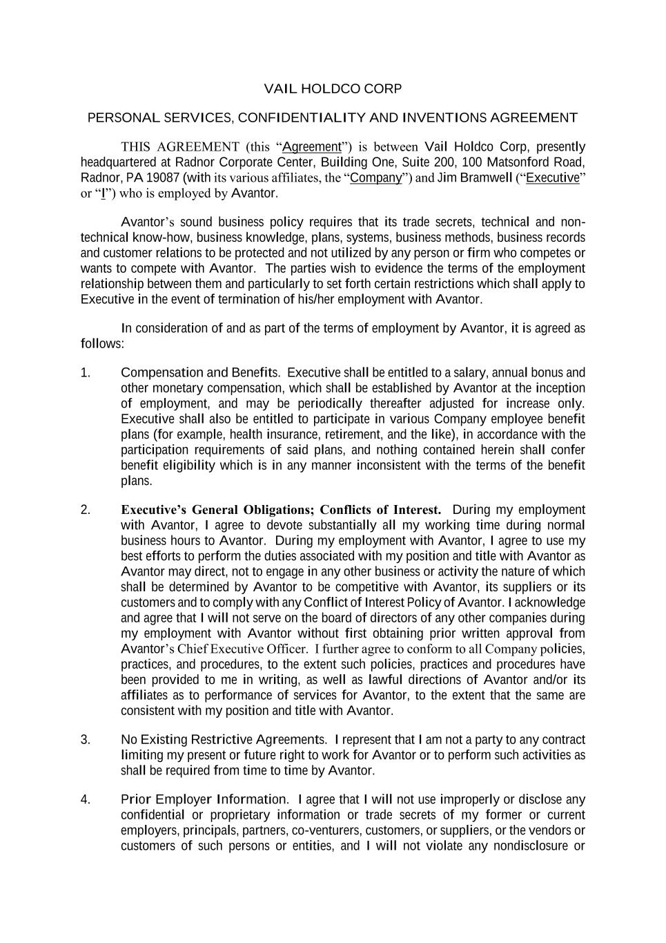 VAIL HOLDCO CORP PERSONAL SERVICES, CONFIDENTIALITY AND INVENTIONS AGREEMENT THIS AGREEMENT (this “Agreement”) is between Vail Holdco Corp, presently headquartered at Radnor Corporate Center, Building One, Suite 200, 100 Matsonford Road, Radnor, PA 19087 (with its various affiliates, the “Company”) and Jim Bramwell (“Executive” or “I”) who is employed by Avantor. Avantor’s sound business policy requires that its trade secrets, technical and non- technical know-how, business knowledge, plans, systems, business methods, business records and customer relations to be protected and not utilized by any person or firm who competes or wants to compete with Avantor. The parties wish to evidence the terms of the employment relationship between them and particularly to set forth certain restrictions which shall apply to Executive in the event of termination of his/her employment with Avantor. In consideration of and as part of the terms of employment by Avantor, it is agreed as follows: 1. Compensation and Benefits. Executive shall be entitled to a salary, annual bonus and other monetary compensation, which shall be established by Avantor at the inception of employment, and may be periodically thereafter adjusted for increase only. Executive shall also be entitled to participate in various Company employee benefit plans (for example, health insurance, retirement, and the like), in accordance with the participation requirements of said plans, and nothing contained herein shall confer benefit eligibility which is in any manner inconsistent with the terms of the benefit plans. 2. Executive’s General Obligations; Conflicts of Interest. During my employment with Avantor, I agree to devote substantially all my working time during normal business hours to Avantor. During my employment with Avantor, I agree to use my best efforts to perform the duties associated with my position and title with Avantor as Avantor may direct, not to engage in any other business or activity the nature of which shall be determined by Avantor to be competitive with Avantor, its suppliers or its customers and to comply with any Conflict of Interest Policy of Avantor. I acknowledge and agree that I will not serve on the board of directors of any other companies during my employment with Avantor without first obtaining prior written approval from Avantor’s Chief Executive Officer. I further agree to conform to all Company policies, practices, and procedures, to the extent such policies, practices and procedures have been provided to me in writing, as well as lawful directions of Avantor and/or its affiliates as to performance of services for Avantor, to the extent that the same are consistent with my position and title with Avantor. 3. No Existing Restrictive Agreements. I represent that I am not a party to any contract limiting my present or future right to work for Avantor or to perform such activities as shall be required from time to time by Avantor. 4. Prior Employer Information. I agree that I will not use improperly or disclose any confidential or proprietary information or trade secrets of my former or current employers, principals, partners, co-venturers, customers, or suppliers, or the vendors or customers of such persons or entities, and I will not violate any nondisclosure or