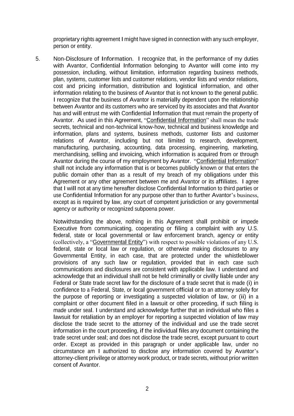 2 proprietary rights agreement I might have signed in connection with any such employer, person or entity. 5. Non-Disclosure of Information. I recognize that, in the performance of my duties with Avantor, Confidential Information belonging to Avantor will come into my possession, including, without limitation, information regarding business methods, plan, systems, customer lists and customer relations, vendor lists and vendor relations, cost and pricing information, distribution and logistical information, and other information relating to the business of Avantor that is not known to the general public. I recognize that the business of Avantor is materially dependent upon the relationship between Avantor and its customers who are serviced by its associates and that Avantor has and will entrust me with Confidential Information that must remain the property of Avantor. As used in this Agreement, “Confidential Information” shall mean the trade secrets, technical and non-technical know-how, technical and business knowledge and information, plans and systems, business methods, customer lists and customer relations of Avantor, including but not limited to research, development, manufacturing, purchasing, accounting, data processing, engineering, marketing, merchandising, selling and invoicing, which information is acquired from or through Avantor during the course of my employment by Avantor. “Confidential Information” shall not include any information that is or becomes publicly known or that enters the public domain other than as a result of my breach of my obligations under this Agreement or any other agreement between me and Avantor or its affiliates. I agree that I will not at any time hereafter disclose Confidential Information to third parties or use Confidential Information for any purpose other than to further Avantor’s business, except as is required by law, any court of competent jurisdiction or any governmental agency or authority or recognized subpoena power. Notwithstanding the above, nothing in this Agreement shall prohibit or impede Executive from communicating, cooperating or filing a complaint with any U.S. federal, state or local governmental or law enforcement branch, agency or entity (collectively, a “Governmental Entity”) with respect to possible violations of any U.S. federal, state or local law or regulation, or otherwise making disclosures to any Governmental Entity, in each case, that are protected under the whistleblower provisions of any such law or regulation, provided that in each case such communications and disclosures are consistent with applicable law. I understand and acknowledge that an individual shall not be held criminally or civilly liable under any Federal or State trade secret law for the disclosure of a trade secret that is made (i) in confidence to a Federal, State, or local government official or to an attorney solely for the purpose of reporting or investigating a suspected violation of law, or (ii) in a complaint or other document filed in a lawsuit or other proceeding, if such filing is made under seal. I understand and acknowledge further that an individual who files a lawsuit for retaliation by an employer for reporting a suspected violation of law may disclose the trade secret to the attorney of the individual and use the trade secret information in the court proceeding, if the individual files any document containing the trade secret under seal; and does not disclose the trade secret, except pursuant to court order. Except as provided in this paragraph or under applicable law, under no circumstance am I authorized to disclose any information covered by Avantor’s attorney-client privilege or attorney work product, or trade secrets, without prior written consent of Avantor.