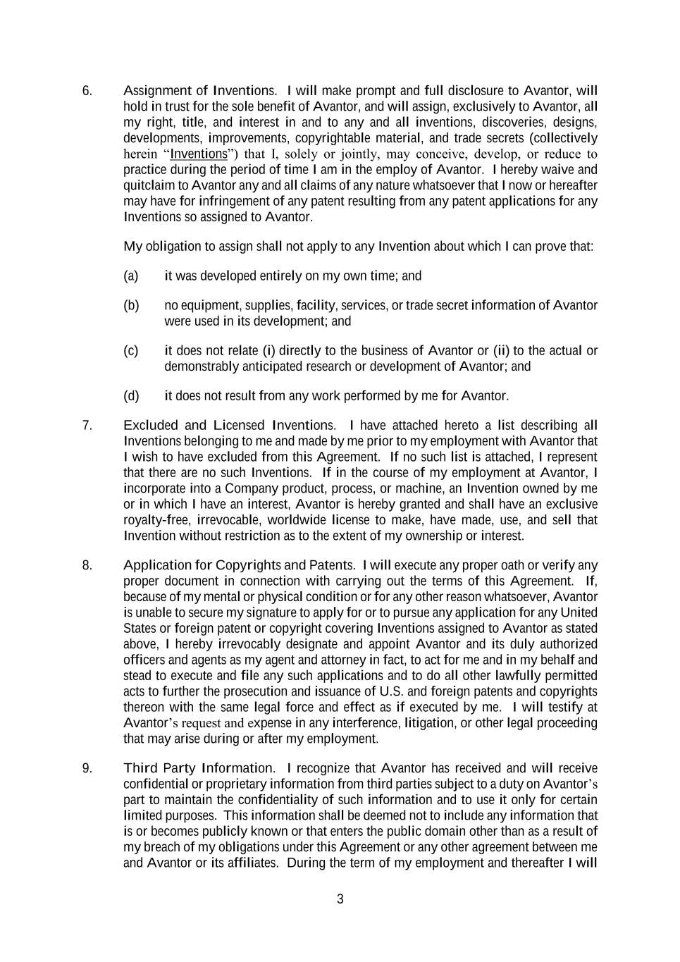 3 6. Assignment of Inventions. I will make prompt and full disclosure to Avantor, will hold in trust for the sole benefit of Avantor, and will assign, exclusively to Avantor, all my right, title, and interest in and to any and all inventions, discoveries, designs, developments, improvements, copyrightable material, and trade secrets (collectively herein “Inventions”) that I, solely or jointly, may conceive, develop, or reduce to practice during the period of time I am in the employ of Avantor. I hereby waive and quitclaim to Avantor any and all claims of any nature whatsoever that I now or hereafter may have for infringement of any patent resulting from any patent applications for any Inventions so assigned to Avantor. My obligation to assign shall not apply to any Invention about which I can prove that: (a) it was developed entirely on my own time; and (b) no equipment, supplies, facility, services, or trade secret information of Avantor were used in its development; and (c) it does not relate (i) directly to the business of Avantor or (ii) to the actual or demonstrably anticipated research or development of Avantor; and (d) it does not result from any work performed by me for Avantor. 7. Excluded and Licensed Inventions. I have attached hereto a list describing all Inventions belonging to me and made by me prior to my employment with Avantor that I wish to have excluded from this Agreement. If no such list is attached, I represent that there are no such Inventions. If in the course of my employment at Avantor, I incorporate into a Company product, process, or machine, an Invention owned by me or in which I have an interest, Avantor is hereby granted and shall have an exclusive royalty-free, irrevocable, worldwide license to make, have made, use, and sell that Invention without restriction as to the extent of my ownership or interest. 8. Application for Copyrights and Patents. I will execute any proper oath or verify any proper document in connection with carrying out the terms of this Agreement. If, because of my mental or physical condition or for any other reason whatsoever, Avantor is unable to secure my signature to apply for or to pursue any application for any United States or foreign patent or copyright covering Inventions assigned to Avantor as stated above, I hereby irrevocably designate and appoint Avantor and its duly authorized officers and agents as my agent and attorney in fact, to act for me and in my behalf and stead to execute and file any such applications and to do all other lawfully permitted acts to further the prosecution and issuance of U.S. and foreign patents and copyrights thereon with the same legal force and effect as if executed by me. I will testify at Avantor’s request and expense in any interference, litigation, or other legal proceeding that may arise during or after my employment. 9. Third Party Information. I recognize that Avantor has received and will receive confidential or proprietary information from third parties subject to a duty on Avantor’s part to maintain the confidentiality of such information and to use it only for certain limited purposes. This information shall be deemed not to include any information that is or becomes publicly known or that enters the public domain other than as a result of my breach of my obligations under this Agreement or any other agreement between me and Avantor or its affiliates. During the term of my employment and thereafter I will