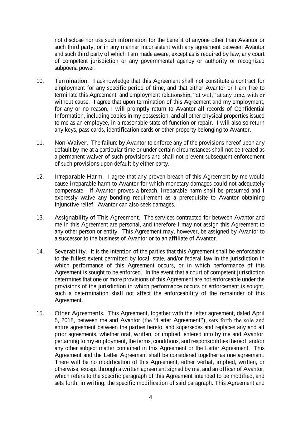 4 not disclose nor use such information for the benefit of anyone other than Avantor or such third party, or in any manner inconsistent with any agreement between Avantor and such third party of which I am made aware, except as is required by law, any court of competent jurisdiction or any governmental agency or authority or recognized subpoena power. 10. Termination. I acknowledge that this Agreement shall not constitute a contract for employment for any specific period of time, and that either Avantor or I am free to terminate this Agreement, and employment relationship, “at will,” at any time, with or without cause. I agree that upon termination of this Agreement and my employment, for any or no reason, I will promptly return to Avantor all records of Confidential Information, including copies in my possession, and all other physical properties issued to me as an employee, in a reasonable state of function or repair. I will also so return any keys, pass cards, identification cards or other property belonging to Avantor. 11. Non-Waiver. The failure by Avantor to enforce any of the provisions hereof upon any default by me at a particular time or under certain circumstances shall not be treated as a permanent waiver of such provisions and shall not prevent subsequent enforcement of such provisions upon default by either party. 12. Irreparable Harm. I agree that any proven breach of this Agreement by me would cause irreparable harm to Avantor for which monetary damages could not adequately compensate. If Avantor proves a breach, irreparable harm shall be presumed and I expressly waive any bonding requirement as a prerequisite to Avantor obtaining injunctive relief. Avantor can also seek damages. 13. Assignability of This Agreement. The services contracted for between Avantor and me in this Agreement are personal, and therefore I may not assign this Agreement to any other person or entity. This Agreement may, however, be assigned by Avantor to a successor to the business of Avantor or to an affiliate of Avantor. 14. Severability. It is the intention of the parties that this Agreement shall be enforceable to the fullest extent permitted by local, state, and/or federal law in the jurisdiction in which performance of this Agreement occurs, or in which performance of this Agreement is sought to be enforced. In the event that a court of competent jurisdiction determines that one or more provisions of this Agreement are not enforceable under the provisions of the jurisdiction in which performance occurs or enforcement is sought, such a determination shall not affect the enforceability of the remainder of this Agreement. 15. Other Agreements. This Agreement, together with the letter agreement, dated April 5, 2018, between me and Avantor (the “Letter Agreement”), sets forth the sole and entire agreement between the parties hereto, and supersedes and replaces any and all prior agreements, whether oral, written, or implied, entered into by me and Avantor, pertaining to my employment, the terms, conditions, and responsibilities thereof, and/or any other subject matter contained in this Agreement or the Letter Agreement. This Agreement and the Letter Agreement shall be considered together as one agreement. There will be no modification of this Agreement, either verbal, implied, written, or otherwise, except through a written agreement signed by me, and an officer of Avantor, which refers to the specific paragraph of this Agreement intended to be modified, and sets forth, in writing, the specific modification of said paragraph. This Agreement and