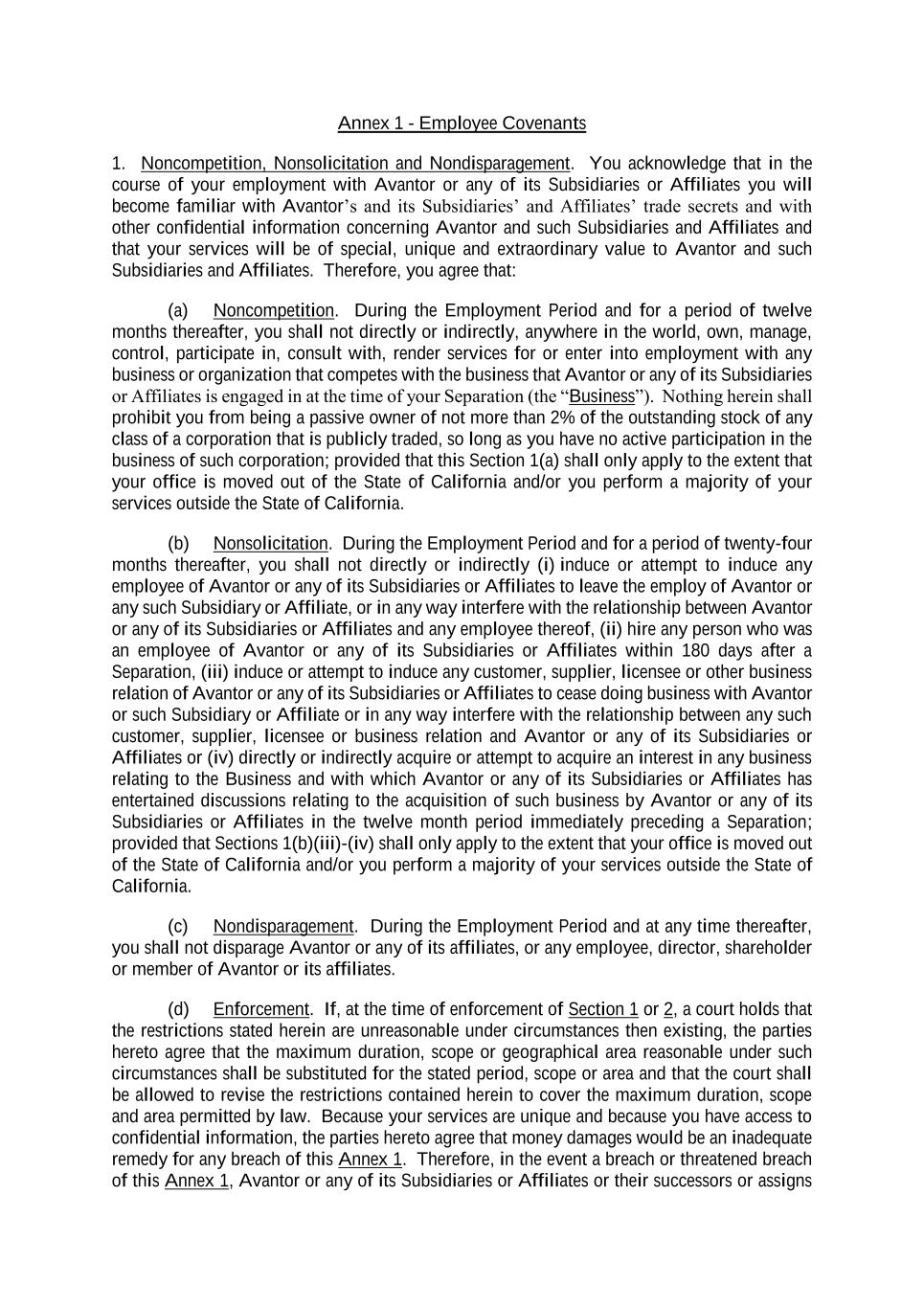 Annex 1 - Employee Covenants 1. Noncompetition, Nonsolicitation and Nondisparagement. You acknowledge that in the course of your employment with Avantor or any of its Subsidiaries or Affiliates you will become familiar with Avantor’s and its Subsidiaries’ and Affiliates’ trade secrets and with other confidential information concerning Avantor and such Subsidiaries and Affiliates and that your services will be of special, unique and extraordinary value to Avantor and such Subsidiaries and Affiliates. Therefore, you agree that: (a) Noncompetition. During the Employment Period and for a period of twelve months thereafter, you shall not directly or indirectly, anywhere in the world, own, manage, control, participate in, consult with, render services for or enter into employment with any business or organization that competes with the business that Avantor or any of its Subsidiaries or Affiliates is engaged in at the time of your Separation (the “Business”). Nothing herein shall prohibit you from being a passive owner of not more than 2% of the outstanding stock of any class of a corporation that is publicly traded, so long as you have no active participation in the business of such corporation; provided that this Section 1(a) shall only apply to the extent that your office is moved out of the State of California and/or you perform a majority of your services outside the State of California. (b) Nonsolicitation. During the Employment Period and for a period of twenty-four months thereafter, you shall not directly or indirectly (i) induce or attempt to induce any employee of Avantor or any of its Subsidiaries or Affiliates to leave the employ of Avantor or any such Subsidiary or Affiliate, or in any way interfere with the relationship between Avantor or any of its Subsidiaries or Affiliates and any employee thereof, (ii) hire any person who was an employee of Avantor or any of its Subsidiaries or Affiliates within 180 days after a Separation, (iii) induce or attempt to induce any customer, supplier, licensee or other business relation of Avantor or any of its Subsidiaries or Affiliates to cease doing business with Avantor or such Subsidiary or Affiliate or in any way interfere with the relationship between any such customer, supplier, licensee or business relation and Avantor or any of its Subsidiaries or Affiliates or (iv) directly or indirectly acquire or attempt to acquire an interest in any business relating to the Business and with which Avantor or any of its Subsidiaries or Affiliates has entertained discussions relating to the acquisition of such business by Avantor or any of its Subsidiaries or Affiliates in the twelve month period immediately preceding a Separation; provided that Sections 1(b)(iii)-(iv) shall only apply to the extent that your office is moved out of the State of California and/or you perform a majority of your services outside the State of California. (c) Nondisparagement. During the Employment Period and at any time thereafter, you shall not disparage Avantor or any of its affiliates, or any employee, director, shareholder or member of Avantor or its affiliates. (d) Enforcement. If, at the time of enforcement of Section 1 or 2, a court holds that the restrictions stated herein are unreasonable under circumstances then existing, the parties hereto agree that the maximum duration, scope or geographical area reasonable under such circumstances shall be substituted for the stated period, scope or area and that the court shall be allowed to revise the restrictions contained herein to cover the maximum duration, scope and area permitted by law. Because your services are unique and because you have access to confidential information, the parties hereto agree that money damages would be an inadequate remedy for any breach of this Annex 1. Therefore, in the event a breach or threatened breach of this Annex 1, Avantor or any of its Subsidiaries or Affiliates or their successors or assigns