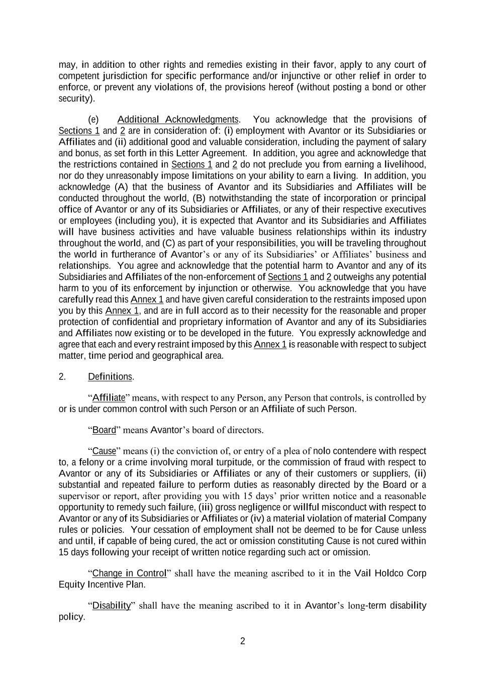 2 may, in addition to other rights and remedies existing in their favor, apply to any court of competent jurisdiction for specific performance and/or injunctive or other relief in order to enforce, or prevent any violations of, the provisions hereof (without posting a bond or other security). (e) Additional Acknowledgments. You acknowledge that the provisions of Sections 1 and 2 are in consideration of: (i) employment with Avantor or its Subsidiaries or Affiliates and (ii) additional good and valuable consideration, including the payment of salary and bonus, as set forth in this Letter Agreement. In addition, you agree and acknowledge that the restrictions contained in Sections 1 and 2 do not preclude you from earning a livelihood, nor do they unreasonably impose limitations on your ability to earn a living. In addition, you acknowledge (A) that the business of Avantor and its Subsidiaries and Affiliates will be conducted throughout the world, (B) notwithstanding the state of incorporation or principal office of Avantor or any of its Subsidiaries or Affiliates, or any of their respective executives or employees (including you), it is expected that Avantor and its Subsidiaries and Affiliates will have business activities and have valuable business relationships within its industry throughout the world, and (C) as part of your responsibilities, you will be traveling throughout the world in furtherance of Avantor’s or any of its Subsidiaries’ or Affiliates’ business and relationships. You agree and acknowledge that the potential harm to Avantor and any of its Subsidiaries and Affiliates of the non-enforcement of Sections 1 and 2 outweighs any potential harm to you of its enforcement by injunction or otherwise. You acknowledge that you have carefully read this Annex 1 and have given careful consideration to the restraints imposed upon you by this Annex 1, and are in full accord as to their necessity for the reasonable and proper protection of confidential and proprietary information of Avantor and any of its Subsidiaries and Affiliates now existing or to be developed in the future. You expressly acknowledge and agree that each and every restraint imposed by this Annex 1 is reasonable with respect to subject matter, time period and geographical area. 2. Definitions. “Affiliate” means, with respect to any Person, any Person that controls, is controlled by or is under common control with such Person or an Affiliate of such Person. “Board” means Avantor’s board of directors. “Cause” means (i) the conviction of, or entry of a plea of nolo contendere with respect to, a felony or a crime involving moral turpitude, or the commission of fraud with respect to Avantor or any of its Subsidiaries or Affiliates or any of their customers or suppliers, (ii) substantial and repeated failure to perform duties as reasonably directed by the Board or a supervisor or report, after providing you with 15 days’ prior written notice and a reasonable opportunity to remedy such failure, (iii) gross negligence or willful misconduct with respect to Avantor or any of its Subsidiaries or Affiliates or (iv) a material violation of material Company rules or policies. Your cessation of employment shall not be deemed to be for Cause unless and until, if capable of being cured, the act or omission constituting Cause is not cured within 15 days following your receipt of written notice regarding such act or omission. “Change in Control” shall have the meaning ascribed to it in the Vail Holdco Corp Equity Incentive Plan. “Disability” shall have the meaning ascribed to it in Avantor’s long-term disability policy.