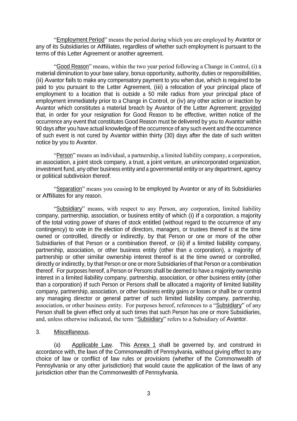 3 “Employment Period” means the period during which you are employed by Avantor or any of its Subsidiaries or Affiliates, regardless of whether such employment is pursuant to the terms of this Letter Agreement or another agreement. “Good Reason” means, within the two year period following a Change in Control, (i) a material diminution to your base salary, bonus opportunity, authority, duties or responsibilities, (ii) Avantor fails to make any compensatory payment to you when due, which is required to be paid to you pursuant to the Letter Agreement, (iii) a relocation of your principal place of employment to a location that is outside a 50 mile radius from your principal place of employment immediately prior to a Change in Control, or (iv) any other action or inaction by Avantor which constitutes a material breach by Avantor of the Letter Agreement; provided that, in order for your resignation for Good Reason to be effective, written notice of the occurrence any event that constitutes Good Reason must be delivered by you to Avantor within 90 days after you have actual knowledge of the occurrence of any such event and the occurrence of such event is not cured by Avantor within thirty (30) days after the date of such written notice by you to Avantor. “Person” means an individual, a partnership, a limited liability company, a corporation, an association, a joint stock company, a trust, a joint venture, an unincorporated organization, investment fund, any other business entity and a governmental entity or any department, agency or political subdivision thereof. “Separation” means you ceasing to be employed by Avantor or any of its Subsidiaries or Affiliates for any reason. “Subsidiary” means, with respect to any Person, any corporation, limited liability company, partnership, association, or business entity of which (i) if a corporation, a majority of the total voting power of shares of stock entitled (without regard to the occurrence of any contingency) to vote in the election of directors, managers, or trustees thereof is at the time owned or controlled, directly or indirectly, by that Person or one or more of the other Subsidiaries of that Person or a combination thereof, or (ii) if a limited liability company, partnership, association, or other business entity (other than a corporation), a majority of partnership or other similar ownership interest thereof is at the time owned or controlled, directly or indirectly, by that Person or one or more Subsidiaries of that Person or a combination thereof. For purposes hereof, a Person or Persons shall be deemed to have a majority ownership interest in a limited liability company, partnership, association, or other business entity (other than a corporation) if such Person or Persons shall be allocated a majority of limited liability company, partnership, association, or other business entity gains or losses or shall be or control any managing director or general partner of such limited liability company, partnership, association, or other business entity. For purposes hereof, references to a “Subsidiary” of any Person shall be given effect only at such times that such Person has one or more Subsidiaries, and, unless otherwise indicated, the term “Subsidiary” refers to a Subsidiary of Avantor. 3. Miscellaneous. (a) Applicable Law. This Annex 1 shall be governed by, and construed in accordance with, the laws of the Commonwealth of Pennsylvania, without giving effect to any choice of law or conflict of law rules or provisions (whether of the Commonwealth of Pennsylvania or any other jurisdiction) that would cause the application of the laws of any jurisdiction other than the Commonwealth of Pennsylvania.