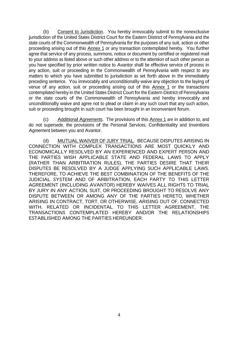 4 (b) Consent to Jurisdiction. You hereby irrevocably submit to the nonexclusive jurisdiction of the United States District Court for the Eastern District of Pennsylvania and the state courts of the Commonwealth of Pennsylvania for the purposes of any suit, action or other proceeding arising out of this Annex 1 or any transaction contemplated hereby. You further agree that service of any process, summons, notice or document by certified or registered mail to your address as listed above or such other address or to the attention of such other person as you have specified by prior written notice to Avantor shall be effective service of process in any action, suit or proceeding in the Commonwealth of Pennsylvania with respect to any matters to which you have submitted to jurisdiction as set forth above in the immediately preceding sentence. You irrevocably and unconditionally waive any objection to the laying of venue of any action, suit or proceeding arising out of this Annex 1 or the transactions contemplated hereby in the United States District Court for the Eastern District of Pennsylvania or the state courts of the Commonwealth of Pennsylvania and hereby irrevocably and unconditionally waive and agree not to plead or claim in any such court that any such action, suit or proceeding brought in such court has been brought in an inconvenient forum. (c) Additional Agreements. The provisions of this Annex 1 are in addition to, and do not supersede, the provisions of the Personal Services, Confidentiality and Inventions Agreement between you and Avantor. (d) MUTUAL WAIVER OF JURY TRIAL. BECAUSE DISPUTES ARISING IN CONNECTION WITH COMPLEX TRANSACTIONS ARE MOST QUICKLY AND ECONOMICALLY RESOLVED BY AN EXPERIENCED AND EXPERT PERSON AND THE PARTIES WISH APPLICABLE STATE AND FEDERAL LAWS TO APPLY (RATHER THAN ARBITRATION RULES), THE PARTIES DESIRE THAT THEIR DISPUTES BE RESOLVED BY A JUDGE APPLYING SUCH APPLICABLE LAWS. THEREFORE, TO ACHIEVE THE BEST COMBINATION OF THE BENEFITS OF THE JUDICIAL SYSTEM AND OF ARBITRATION, EACH PARTY TO THIS LETTER AGREEMENT (INCLUDING AVANTOR) HEREBY WAIVES ALL RIGHTS TO TRIAL BY JURY IN ANY ACTION, SUIT, OR PROCEEDING BROUGHT TO RESOLVE ANY DISPUTE BETWEEN OR AMONG ANY OF THE PARTIES HERETO, WHETHER ARISING IN CONTRACT, TORT, OR OTHERWISE, ARISING OUT OF, CONNECTED WITH, RELATED OR INCIDENTAL TO THIS LETTER AGREEMENT, THE TRANSACTIONS CONTEMPLATED HEREBY AND/OR THE RELATIONSHIPS ESTABLISHED AMONG THE PARTIES HEREUNDER.