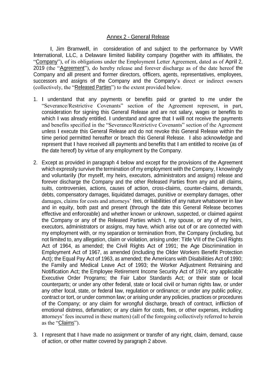 Annex 2 - General Release I, Jim Bramwell, in consideration of and subject to the performance by VWR International, LLC, a Delaware limited liability company (together with its affiliates, the “Company”), of its obligations under the Employment Letter Agreement, dated as of April 2, 2019 (the “Agreement”), do hereby release and forever discharge as of the date hereof the Company and all present and former directors, officers, agents, representatives, employees, successors and assigns of the Company and the Company’s direct or indirect owners (collectively, the “Released Parties”) to the extent provided below. 1. I understand that any payments or benefits paid or granted to me under the “Severance/Restrictive Covenants” section of the Agreement represent, in part, consideration for signing this General Release and are not salary, wages or benefits to which I was already entitled. I understand and agree that I will not receive the payments and benefits specified in the “Severance/Restrictive Covenants” section of the Agreement unless I execute this General Release and do not revoke this General Release within the time period permitted hereafter or breach this General Release. I also acknowledge and represent that I have received all payments and benefits that I am entitled to receive (as of the date hereof) by virtue of any employment by the Company. 2. Except as provided in paragraph 4 below and except for the provisions of the Agreement which expressly survive the termination of my employment with the Company, I knowingly and voluntarily (for myself, my heirs, executors, administrators and assigns) release and forever discharge the Company and the other Released Parties from any and all claims, suits, controversies, actions, causes of action, cross-claims, counter-claims, demands, debts, compensatory damages, liquidated damages, punitive or exemplary damages, other damages, claims for costs and attorneys’ fees, or liabilities of any nature whatsoever in law and in equity, both past and present (through the date this General Release becomes effective and enforceable) and whether known or unknown, suspected, or claimed against the Company or any of the Released Parties which I, my spouse, or any of my heirs, executors, administrators or assigns, may have, which arise out of or are connected with my employment with, or my separation or termination from, the Company (including, but not limited to, any allegation, claim or violation, arising under: Title VII of the Civil Rights Act of 1964, as amended; the Civil Rights Act of 1991; the Age Discrimination in Employment Act of 1967, as amended (including the Older Workers Benefit Protection Act); the Equal Pay Act of 1963, as amended; the Americans with Disabilities Act of 1990; the Family and Medical Leave Act of 1993; the Worker Adjustment Retraining and Notification Act; the Employee Retirement Income Security Act of 1974; any applicable Executive Order Programs; the Fair Labor Standards Act; or their state or local counterparts; or under any other federal, state or local civil or human rights law, or under any other local, state, or federal law, regulation or ordinance; or under any public policy, contract or tort, or under common law; or arising under any policies, practices or procedures of the Company; or any claim for wrongful discharge, breach of contract, infliction of emotional distress, defamation; or any claim for costs, fees, or other expenses, including attorneys’ fees incurred in these matters) (all of the foregoing collectively referred to herein as the “Claims”). 3. I represent that I have made no assignment or transfer of any right, claim, demand, cause of action, or other matter covered by paragraph 2 above.
