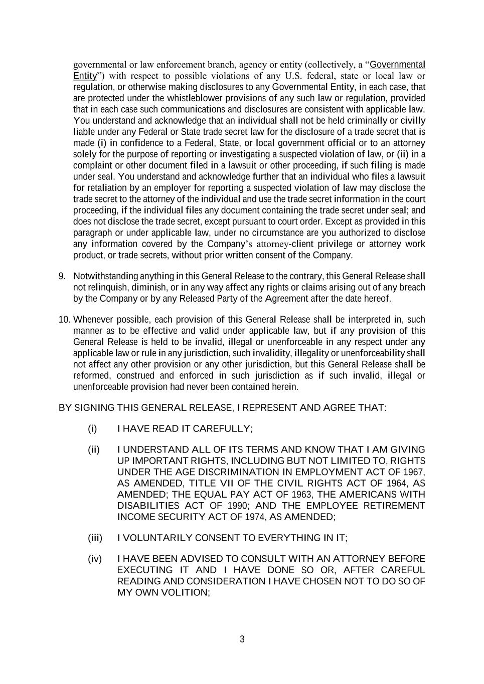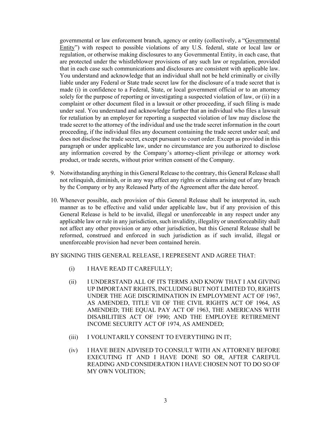 3 governmental or law enforcement branch, agency or entity (collectively, a “Governmental Entity”) with respect to possible violations of any U.S. federal, state or local law or regulation, or otherwise making disclosures to any Governmental Entity, in each case, that are protected under the whistleblower provisions of any such law or regulation, provided that in each case such communications and disclosures are consistent with applicable law. You understand and acknowledge that an individual shall not be held criminally or civilly liable under any Federal or State trade secret law for the disclosure of a trade secret that is made (i) in confidence to a Federal, State, or local government official or to an attorney solely for the purpose of reporting or investigating a suspected violation of law, or (ii) in a complaint or other document filed in a lawsuit or other proceeding, if such filing is made under seal. You understand and acknowledge further that an individual who files a lawsuit for retaliation by an employer for reporting a suspected violation of law may disclose the trade secret to the attorney of the individual and use the trade secret information in the court proceeding, if the individual files any document containing the trade secret under seal; and does not disclose the trade secret, except pursuant to court order. Except as provided in this paragraph or under applicable law, under no circumstance are you authorized to disclose any information covered by the Company’s attorney-client privilege or attorney work product, or trade secrets, without prior written consent of the Company. 9. Notwithstanding anything in this General Release to the contrary, this General Release shall not relinquish, diminish, or in any way affect any rights or claims arising out of any breach by the Company or by any Released Party of the Agreement after the date hereof. 10. Whenever possible, each provision of this General Release shall be interpreted in, such manner as to be effective and valid under applicable law, but if any provision of this General Release is held to be invalid, illegal or unenforceable in any respect under any applicable law or rule in any jurisdiction, such invalidity, illegality or unenforceability shall not affect any other provision or any other jurisdiction, but this General Release shall be reformed, construed and enforced in such jurisdiction as if such invalid, illegal or unenforceable provision had never been contained herein. BY SIGNING THIS GENERAL RELEASE, I REPRESENT AND AGREE THAT: (i) I HAVE READ IT CAREFULLY; (ii) I UNDERSTAND ALL OF ITS TERMS AND KNOW THAT I AM GIVING UP IMPORTANT RIGHTS, INCLUDING BUT NOT LIMITED TO, RIGHTS UNDER THE AGE DISCRIMINATION IN EMPLOYMENT ACT OF 1967, AS AMENDED, TITLE VII OF THE CIVIL RIGHTS ACT OF 1964, AS AMENDED; THE EQUAL PAY ACT OF 1963, THE AMERICANS WITH DISABILITIES ACT OF 1990; AND THE EMPLOYEE RETIREMENT INCOME SECURITY ACT OF 1974, AS AMENDED; (iii) I VOLUNTARILY CONSENT TO EVERYTHING IN IT; (iv) I HAVE BEEN ADVISED TO CONSULT WITH AN ATTORNEY BEFORE EXECUTING IT AND I HAVE DONE SO OR, AFTER CAREFUL READING AND CONSIDERATION I HAVE CHOSEN NOT TO DO SO OF MY OWN VOLITION;