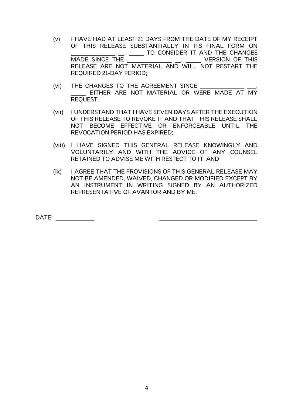 4 (v) I HAVE HAD AT LEAST 21 DAYS FROM THE DATE OF MY RECEIPT OF THIS RELEASE SUBSTANTIALLY IN ITS FINAL FORM ON _______________ __, _____ TO CONSIDER IT AND THE CHANGES MADE SINCE THE _______________ __, _____ VERSION OF THIS RELEASE ARE NOT MATERIAL AND WILL NOT RESTART THE REQUIRED 21-DAY PERIOD; (vi) THE CHANGES TO THE AGREEMENT SINCE _______________ ___, _____ EITHER ARE NOT MATERIAL OR WERE MADE AT MY REQUEST. (vii) I UNDERSTAND THAT I HAVE SEVEN DAYS AFTER THE EXECUTION OF THIS RELEASE TO REVOKE IT AND THAT THIS RELEASE SHALL NOT BECOME EFFECTIVE OR ENFORCEABLE UNTIL THE REVOCATION PERIOD HAS EXPIRED; (viii) I HAVE SIGNED THIS GENERAL RELEASE KNOWINGLY AND VOLUNTARILY AND WITH THE ADVICE OF ANY COUNSEL RETAINED TO ADVISE ME WITH RESPECT TO IT; AND (ix) I AGREE THAT THE PROVISIONS OF THIS GENERAL RELEASE MAY NOT BE AMENDED, WAIVED, CHANGED OR MODIFIED EXCEPT BY AN INSTRUMENT IN WRITING SIGNED BY AN AUTHORIZED REPRESENTATIVE OF AVANTOR AND BY ME. DATE: _____________ _________________________________