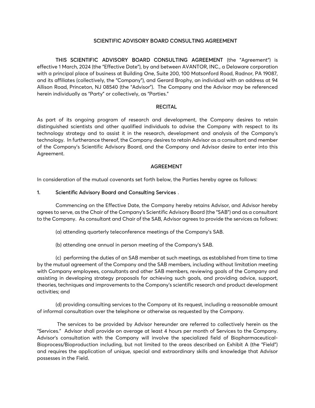 SCIENTIFIC ADVISORY BOARD CONSULTING AGREEMENT THIS SCIENTIFIC ADVISORY BOARD CONSULTING AGREEMENT (the “Agreement”) is effective 1 March, 2024 (the “Effective Date”), by and between AVANTOR, INC., a Delaware corporation with a principal place of business at Building One, Suite 200, 100 Matsonford Road, Radnor, PA 19087, and its affiliates (collectively, the “Company”), and Gerard Brophy, an individual with an address at 94 Allison Road, Princeton, NJ 08540 (the “Advisor”). The Company and the Advisor may be referenced herein individually as “Party” or collectively, as “Parties.” RECITAL As part of its ongoing program of research and development, the Company desires to retain distinguished scientists and other qualified individuals to advise the Company with respect to its technology strategy and to assist it in the research, development and analysis of the Company’s technology. In furtherance thereof, the Company desires to retain Advisor as a consultant and member of the Company’s Scientific Advisory Board, and the Company and Advisor desire to enter into this Agreement. AGREEMENT In consideration of the mutual covenants set forth below, the Parties hereby agree as follows: 1. Scientific Advisory Board and Consulting Services . Commencing on the Effective Date, the Company hereby retains Advisor, and Advisor hereby agrees to serve, as the Chair of the Company’s Scientific Advisory Board (the “SAB”) and as a consultant to the Company. As consultant and Chair of the SAB, Advisor agrees to provide the services as follows: (a) attending quarterly teleconference meetings of the Company’s SAB. (b) attending one annual in person meeting of the Company’s SAB. (c) performing the duties of an SAB member at such meetings, as established from time to time by the mutual agreement of the Company and the SAB members, including without limitation meeting with Company employees, consultants and other SAB members, reviewing goals of the Company and assisting in developing strategy proposals for achieving such goals, and providing advice, support, theories, techniques and improvements to the Company’s scientific research and product development activities; and (d) providing consulting services to the Company at its request, including a reasonable amount of informal consultation over the telephone or otherwise as requested by the Company. The services to be provided by Advisor hereunder are referred to collectively herein as the “Services.” Advisor shall provide on average at least 4 hours per month of Services to the Company. Advisor’s consultation with the Company will involve the specialized field of Biopharmaceutical- Bioprocess/Bioproduction including, but not limited to the areas described on Exhibit A (the “Field”) and requires the application of unique, special and extraordinary skills and knowledge that Advisor possesses in the Field.