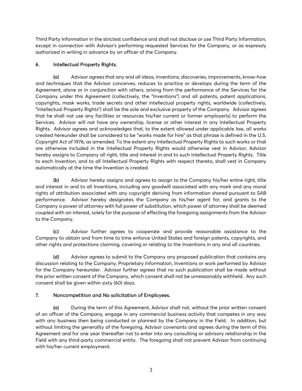 3 Third Party Information in the strictest confidence and shall not disclose or use Third Party Information, except in connection with Advisor’s performing requested Services for the Company, or as expressly authorized in writing in advance by an officer of the Company. 6. Intellectual Property Rights. (a) Advisor agrees that any and all ideas, inventions, discoveries, improvements, know-how and techniques that the Advisor conceives, reduces to practice or develops during the term of the Agreement, alone or in conjunction with others, arising from the performance of the Services for the Company under this Agreement (collectively, the “Inventions”) and all patents, patent applications, copyrights, mask works, trade secrets and other intellectual property rights, worldwide (collectively, "Intellectual Property Rights") shall be the sole and exclusive property of the Company. Advisor agrees that he shall not use any facilities or resources his/her current or former employer(s) to perform the Services. Advisor will not have any ownership, license or other interest in any Intellectual Property Rights. Advisor agrees and acknowledges that, to the extent allowed under applicable law, all works created hereunder shall be considered to be "works made for hire" as that phrase is defined in the U.S. Copyright Act of 1976, as amended. To the extent any Intellectual Property Rights to such works or that are otherwise included in the Intellectual Property Rights would otherwise vest in Advisor, Advisor hereby assigns to Company all right, title and interest in and to such Intellectual Property Rights. Title to each Invention, and to all Intellectual Property Rights with respect thereto, shall vest in Company automatically at the time the Invention is created. (b) Advisor hereby assigns and agrees to assign to the Company his/her entire right, title and interest in and to all Inventions, including any goodwill associated with any mark and any moral rights of attribution associated with any copyright deriving from information shared pursuant to SAB performance. Advisor hereby designates the Company as his/her agent for, and grants to the Company a power of attorney with full power of substitution, which power of attorney shall be deemed coupled with an interest, solely for the purpose of effecting the foregoing assignments from the Advisor to the Company. (c) Advisor further agrees to cooperate and provide reasonable assistance to the Company to obtain and from time to time enforce United States and foreign patents, copyrights, and other rights and protections claiming, covering or relating to the Inventions in any and all countries. (d) Advisor agrees to submit to the Company any proposed publication that contains any discussion relating to the Company, Proprietary Information, Inventions or work performed by Advisor for the Company hereunder. Advisor further agrees that no such publication shall be made without the prior written consent of the Company, which consent shall not be unreasonably withheld. Any such consent shall be given within sixty (60) days. 7. Noncompetition and No solicitation of Employees. (a) During the term of this Agreement, Advisor shall not, without the prior written consent of an officer of the Company, engage in any commercial business activity that competes in any way with any business then being conducted or planned by the Company in the Field. In addition, but without limiting the generality of the foregoing, Advisor covenants and agrees during the term of this Agreement and for one year thereafter not to enter into any consulting or advisory relationship in the Field with any third-party commercial entity. The foregoing shall not prevent Advisor from continuing with his/her current employment.