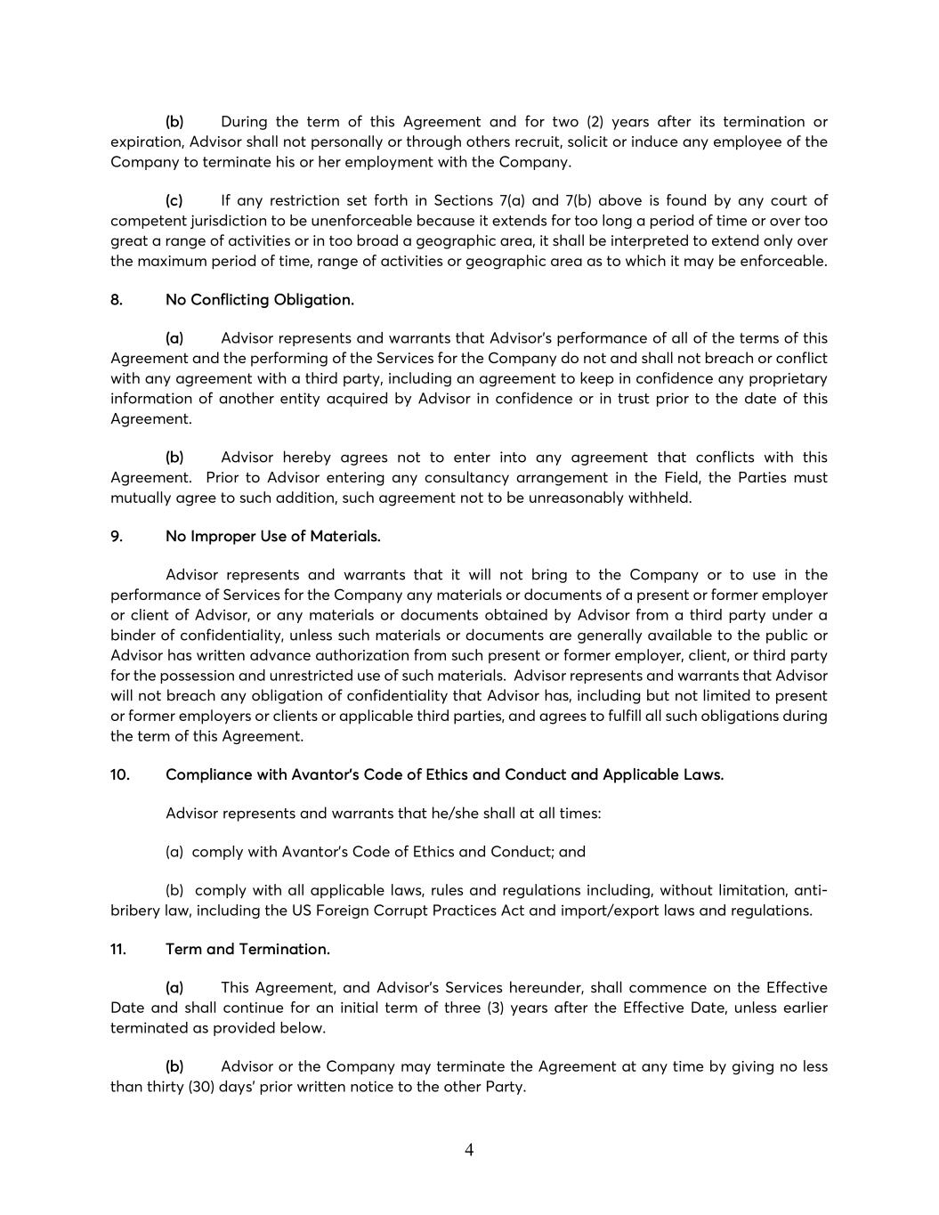 4 (b) During the term of this Agreement and for two (2) years after its termination or expiration, Advisor shall not personally or through others recruit, solicit or induce any employee of the Company to terminate his or her employment with the Company. (c) If any restriction set forth in Sections 7(a) and 7(b) above is found by any court of competent jurisdiction to be unenforceable because it extends for too long a period of time or over too great a range of activities or in too broad a geographic area, it shall be interpreted to extend only over the maximum period of time, range of activities or geographic area as to which it may be enforceable. 8. No Conflicting Obligation. (a) Advisor represents and warrants that Advisor’s performance of all of the terms of this Agreement and the performing of the Services for the Company do not and shall not breach or conflict with any agreement with a third party, including an agreement to keep in confidence any proprietary information of another entity acquired by Advisor in confidence or in trust prior to the date of this Agreement. (b) Advisor hereby agrees not to enter into any agreement that conflicts with this Agreement. Prior to Advisor entering any consultancy arrangement in the Field, the Parties must mutually agree to such addition, such agreement not to be unreasonably withheld. 9. No Improper Use of Materials. Advisor represents and warrants that it will not bring to the Company or to use in the performance of Services for the Company any materials or documents of a present or former employer or client of Advisor, or any materials or documents obtained by Advisor from a third party under a binder of confidentiality, unless such materials or documents are generally available to the public or Advisor has written advance authorization from such present or former employer, client, or third party for the possession and unrestricted use of such materials. Advisor represents and warrants that Advisor will not breach any obligation of confidentiality that Advisor has, including but not limited to present or former employers or clients or applicable third parties, and agrees to fulfill all such obligations during the term of this Agreement. 10. Compliance with Avantor’s Code of Ethics and Conduct and Applicable Laws. Advisor represents and warrants that he/she shall at all times: (a) comply with Avantor’s Code of Ethics and Conduct; and (b) comply with all applicable laws, rules and regulations including, without limitation, anti- bribery law, including the US Foreign Corrupt Practices Act and import/export laws and regulations. 11. Term and Termination. (a) This Agreement, and Advisor’s Services hereunder, shall commence on the Effective Date and shall continue for an initial term of three (3) years after the Effective Date, unless earlier terminated as provided below. (b) Advisor or the Company may terminate the Agreement at any time by giving no less than thirty (30) days’ prior written notice to the other Party.