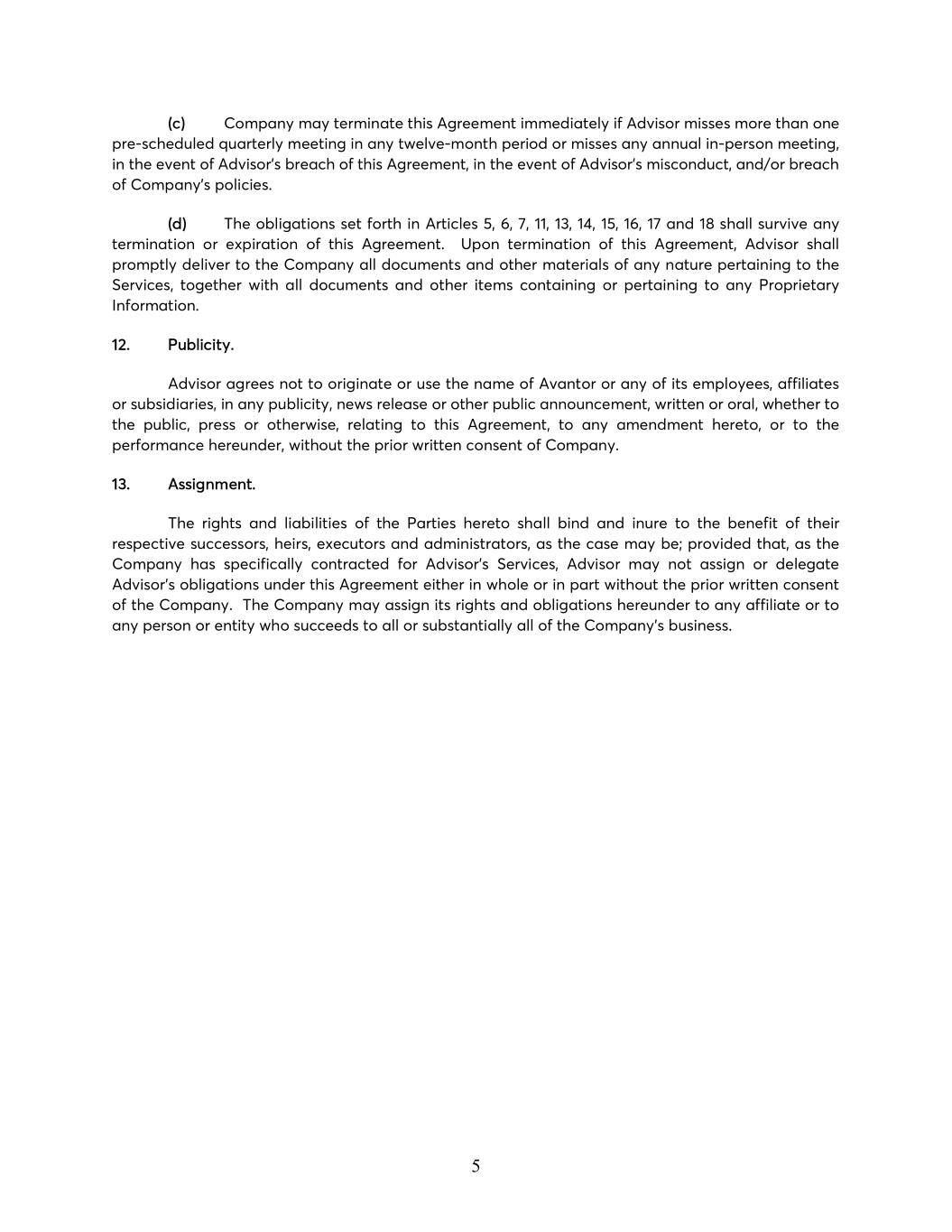 5 (c) Company may terminate this Agreement immediately if Advisor misses more than one pre-scheduled quarterly meeting in any twelve-month period or misses any annual in-person meeting, in the event of Advisor’s breach of this Agreement, in the event of Advisor’s misconduct, and/or breach of Company’s policies. (d) The obligations set forth in Articles 5, 6, 7, 11, 13, 14, 15, 16, 17 and 18 shall survive any termination or expiration of this Agreement. Upon termination of this Agreement, Advisor shall promptly deliver to the Company all documents and other materials of any nature pertaining to the Services, together with all documents and other items containing or pertaining to any Proprietary Information. 12. Publicity. Advisor agrees not to originate or use the name of Avantor or any of its employees, affiliates or subsidiaries, in any publicity, news release or other public announcement, written or oral, whether to the public, press or otherwise, relating to this Agreement, to any amendment hereto, or to the performance hereunder, without the prior written consent of Company. 13. Assignment. The rights and liabilities of the Parties hereto shall bind and inure to the benefit of their respective successors, heirs, executors and administrators, as the case may be; provided that, as the Company has specifically contracted for Advisor’s Services, Advisor may not assign or delegate Advisor’s obligations under this Agreement either in whole or in part without the prior written consent of the Company. The Company may assign its rights and obligations hereunder to any affiliate or to any person or entity who succeeds to all or substantially all of the Company’s business.