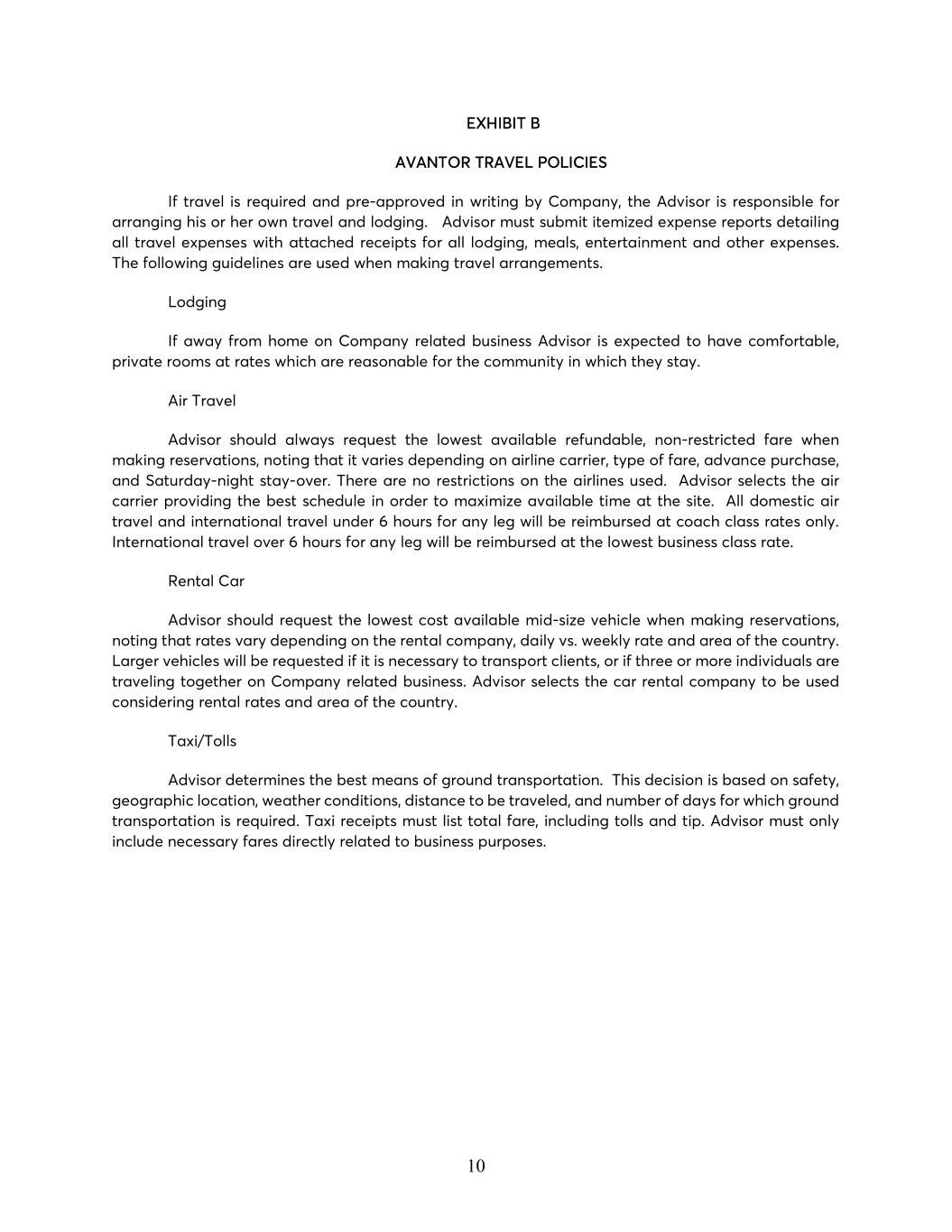 10 EXHIBIT B AVANTOR TRAVEL POLICIES If travel is required and pre-approved in writing by Company, the Advisor is responsible for arranging his or her own travel and lodging. Advisor must submit itemized expense reports detailing all travel expenses with attached receipts for all lodging, meals, entertainment and other expenses. The following guidelines are used when making travel arrangements. Lodging If away from home on Company related business Advisor is expected to have comfortable, private rooms at rates which are reasonable for the community in which they stay. Air Travel Advisor should always request the lowest available refundable, non-restricted fare when making reservations, noting that it varies depending on airline carrier, type of fare, advance purchase, and Saturday-night stay-over. There are no restrictions on the airlines used. Advisor selects the air carrier providing the best schedule in order to maximize available time at the site. All domestic air travel and international travel under 6 hours for any leg will be reimbursed at coach class rates only. International travel over 6 hours for any leg will be reimbursed at the lowest business class rate. Rental Car Advisor should request the lowest cost available mid-size vehicle when making reservations, noting that rates vary depending on the rental company, daily vs. weekly rate and area of the country. Larger vehicles will be requested if it is necessary to transport clients, or if three or more individuals are traveling together on Company related business. Advisor selects the car rental company to be used considering rental rates and area of the country. Taxi/Tolls Advisor determines the best means of ground transportation. This decision is based on safety, geographic location, weather conditions, distance to be traveled, and number of days for which ground transportation is required. Taxi receipts must list total fare, including tolls and tip. Advisor must only include necessary fares directly related to business purposes.