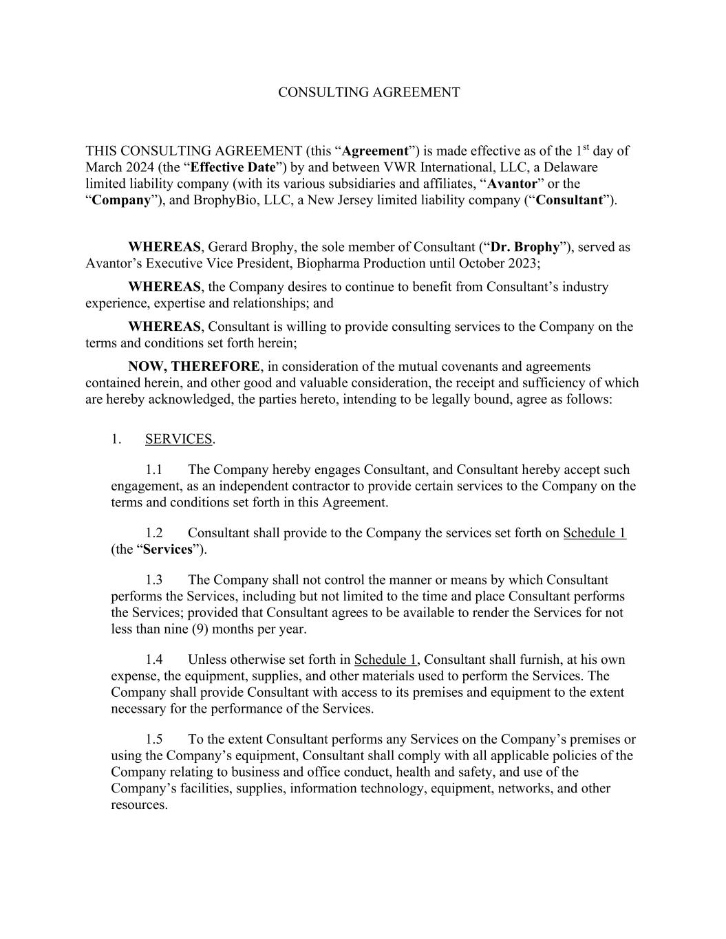 CONSULTING AGREEMENT THIS CONSULTING AGREEMENT (this “Agreement”) is made effective as of the 1st day of March 2024 (the “Effective Date”) by and between VWR International, LLC, a Delaware limited liability company (with its various subsidiaries and affiliates, “Avantor” or the “Company”), and BrophyBio, LLC, a New Jersey limited liability company (“Consultant”). WHEREAS, Gerard Brophy, the sole member of Consultant (“Dr. Brophy”), served as Avantor’s Executive Vice President, Biopharma Production until October 2023; WHEREAS, the Company desires to continue to benefit from Consultant’s industry experience, expertise and relationships; and WHEREAS, Consultant is willing to provide consulting services to the Company on the terms and conditions set forth herein; NOW, THEREFORE, in consideration of the mutual covenants and agreements contained herein, and other good and valuable consideration, the receipt and sufficiency of which are hereby acknowledged, the parties hereto, intending to be legally bound, agree as follows: 1. SERVICES. 1.1 The Company hereby engages Consultant, and Consultant hereby accept such engagement, as an independent contractor to provide certain services to the Company on the terms and conditions set forth in this Agreement. 1.2 Consultant shall provide to the Company the services set forth on Schedule 1 (the “Services”). 1.3 The Company shall not control the manner or means by which Consultant performs the Services, including but not limited to the time and place Consultant performs the Services; provided that Consultant agrees to be available to render the Services for not less than nine (9) months per year. 1.4 Unless otherwise set forth in Schedule 1, Consultant shall furnish, at his own expense, the equipment, supplies, and other materials used to perform the Services. The Company shall provide Consultant with access to its premises and equipment to the extent necessary for the performance of the Services. 1.5 To the extent Consultant performs any Services on the Company’s premises or using the Company’s equipment, Consultant shall comply with all applicable policies of the Company relating to business and office conduct, health and safety, and use of the Company’s facilities, supplies, information technology, equipment, networks, and other resources.
