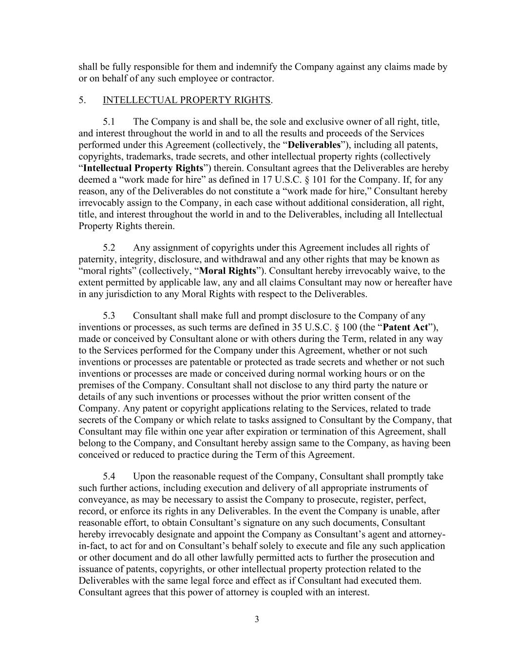 3 shall be fully responsible for them and indemnify the Company against any claims made by or on behalf of any such employee or contractor. 5. INTELLECTUAL PROPERTY RIGHTS. 5.1 The Company is and shall be, the sole and exclusive owner of all right, title, and interest throughout the world in and to all the results and proceeds of the Services performed under this Agreement (collectively, the “Deliverables”), including all patents, copyrights, trademarks, trade secrets, and other intellectual property rights (collectively “Intellectual Property Rights”) therein. Consultant agrees that the Deliverables are hereby deemed a “work made for hire” as defined in 17 U.S.C. § 101 for the Company. If, for any reason, any of the Deliverables do not constitute a “work made for hire,” Consultant hereby irrevocably assign to the Company, in each case without additional consideration, all right, title, and interest throughout the world in and to the Deliverables, including all Intellectual Property Rights therein. 5.2 Any assignment of copyrights under this Agreement includes all rights of paternity, integrity, disclosure, and withdrawal and any other rights that may be known as “moral rights” (collectively, “Moral Rights”). Consultant hereby irrevocably waive, to the extent permitted by applicable law, any and all claims Consultant may now or hereafter have in any jurisdiction to any Moral Rights with respect to the Deliverables. 5.3 Consultant shall make full and prompt disclosure to the Company of any inventions or processes, as such terms are defined in 35 U.S.C. § 100 (the “Patent Act”), made or conceived by Consultant alone or with others during the Term, related in any way to the Services performed for the Company under this Agreement, whether or not such inventions or processes are patentable or protected as trade secrets and whether or not such inventions or processes are made or conceived during normal working hours or on the premises of the Company. Consultant shall not disclose to any third party the nature or details of any such inventions or processes without the prior written consent of the Company. Any patent or copyright applications relating to the Services, related to trade secrets of the Company or which relate to tasks assigned to Consultant by the Company, that Consultant may file within one year after expiration or termination of this Agreement, shall belong to the Company, and Consultant hereby assign same to the Company, as having been conceived or reduced to practice during the Term of this Agreement. 5.4 Upon the reasonable request of the Company, Consultant shall promptly take such further actions, including execution and delivery of all appropriate instruments of conveyance, as may be necessary to assist the Company to prosecute, register, perfect, record, or enforce its rights in any Deliverables. In the event the Company is unable, after reasonable effort, to obtain Consultant’s signature on any such documents, Consultant hereby irrevocably designate and appoint the Company as Consultant’s agent and attorney- in-fact, to act for and on Consultant’s behalf solely to execute and file any such application or other document and do all other lawfully permitted acts to further the prosecution and issuance of patents, copyrights, or other intellectual property protection related to the Deliverables with the same legal force and effect as if Consultant had executed them. Consultant agrees that this power of attorney is coupled with an interest.