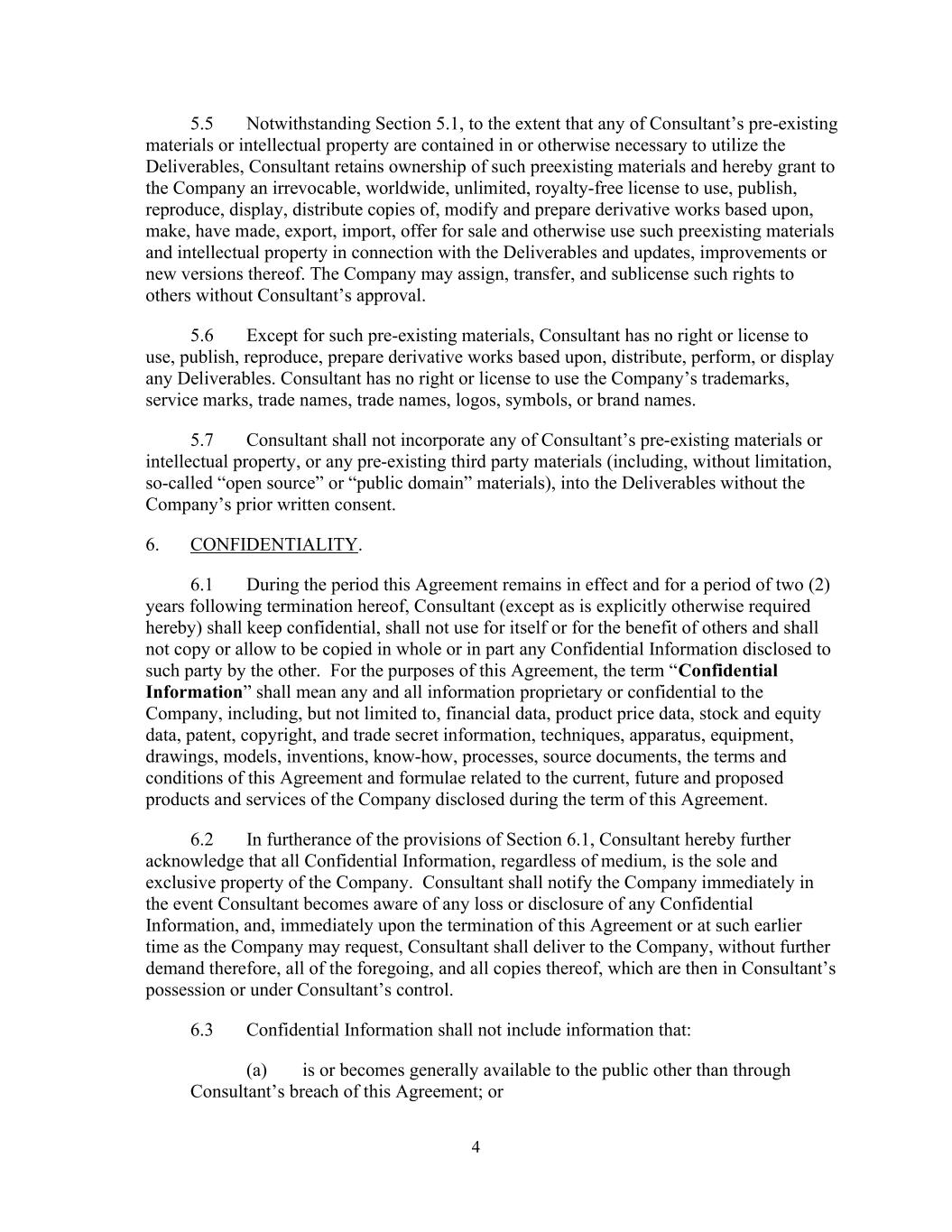 4 5.5 Notwithstanding Section 5.1, to the extent that any of Consultant’s pre-existing materials or intellectual property are contained in or otherwise necessary to utilize the Deliverables, Consultant retains ownership of such preexisting materials and hereby grant to the Company an irrevocable, worldwide, unlimited, royalty-free license to use, publish, reproduce, display, distribute copies of, modify and prepare derivative works based upon, make, have made, export, import, offer for sale and otherwise use such preexisting materials and intellectual property in connection with the Deliverables and updates, improvements or new versions thereof. The Company may assign, transfer, and sublicense such rights to others without Consultant’s approval. 5.6 Except for such pre-existing materials, Consultant has no right or license to use, publish, reproduce, prepare derivative works based upon, distribute, perform, or display any Deliverables. Consultant has no right or license to use the Company’s trademarks, service marks, trade names, trade names, logos, symbols, or brand names. 5.7 Consultant shall not incorporate any of Consultant’s pre-existing materials or intellectual property, or any pre-existing third party materials (including, without limitation, so-called “open source” or “public domain” materials), into the Deliverables without the Company’s prior written consent. 6. CONFIDENTIALITY. 6.1 During the period this Agreement remains in effect and for a period of two (2) years following termination hereof, Consultant (except as is explicitly otherwise required hereby) shall keep confidential, shall not use for itself or for the benefit of others and shall not copy or allow to be copied in whole or in part any Confidential Information disclosed to such party by the other. For the purposes of this Agreement, the term “Confidential Information” shall mean any and all information proprietary or confidential to the Company, including, but not limited to, financial data, product price data, stock and equity data, patent, copyright, and trade secret information, techniques, apparatus, equipment, drawings, models, inventions, know-how, processes, source documents, the terms and conditions of this Agreement and formulae related to the current, future and proposed products and services of the Company disclosed during the term of this Agreement. 6.2 In furtherance of the provisions of Section 6.1, Consultant hereby further acknowledge that all Confidential Information, regardless of medium, is the sole and exclusive property of the Company. Consultant shall notify the Company immediately in the event Consultant becomes aware of any loss or disclosure of any Confidential Information, and, immediately upon the termination of this Agreement or at such earlier time as the Company may request, Consultant shall deliver to the Company, without further demand therefore, all of the foregoing, and all copies thereof, which are then in Consultant’s possession or under Consultant’s control. 6.3 Confidential Information shall not include information that: (a) is or becomes generally available to the public other than through Consultant’s breach of this Agreement; or