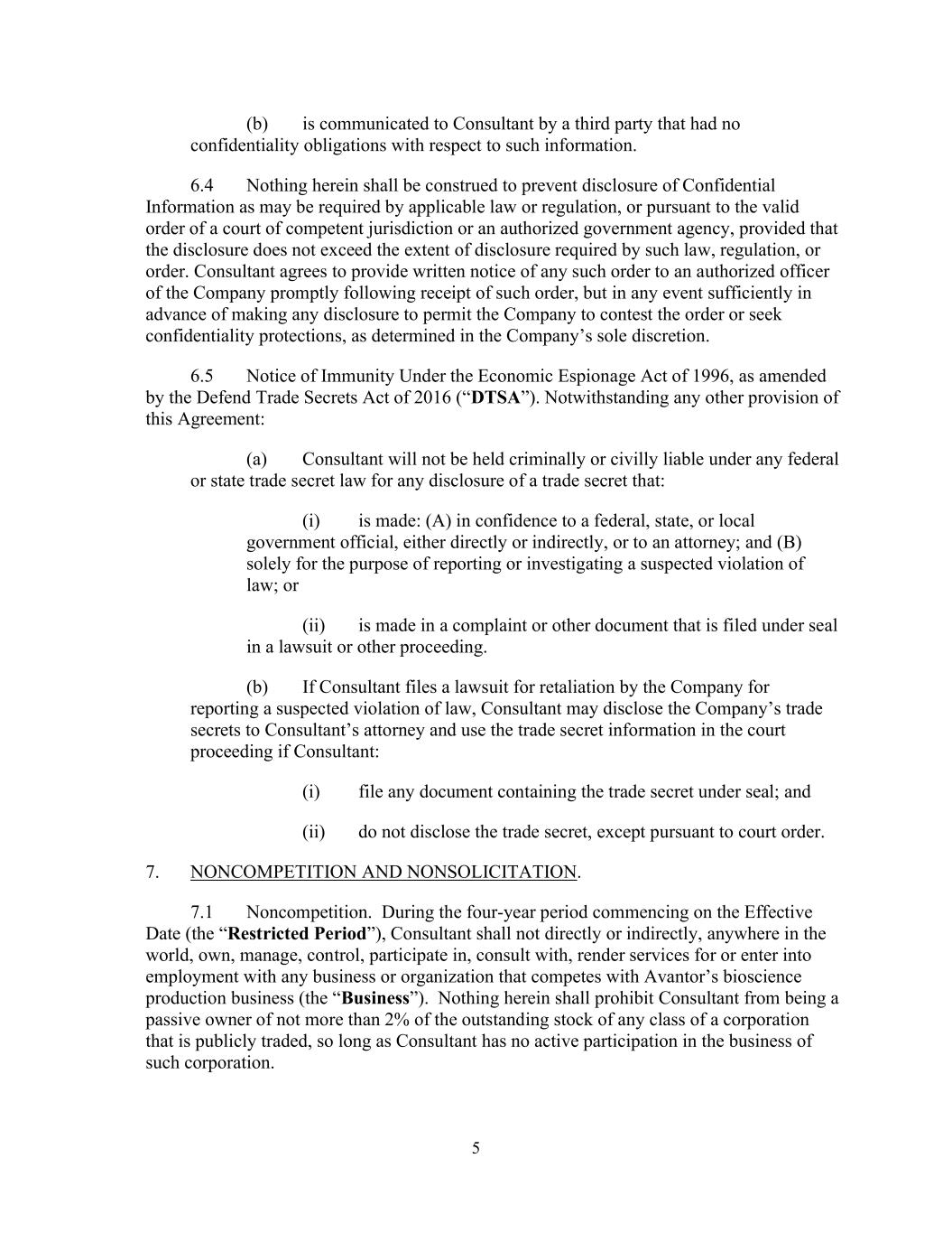 5 (b) is communicated to Consultant by a third party that had no confidentiality obligations with respect to such information. 6.4 Nothing herein shall be construed to prevent disclosure of Confidential Information as may be required by applicable law or regulation, or pursuant to the valid order of a court of competent jurisdiction or an authorized government agency, provided that the disclosure does not exceed the extent of disclosure required by such law, regulation, or order. Consultant agrees to provide written notice of any such order to an authorized officer of the Company promptly following receipt of such order, but in any event sufficiently in advance of making any disclosure to permit the Company to contest the order or seek confidentiality protections, as determined in the Company’s sole discretion. 6.5 Notice of Immunity Under the Economic Espionage Act of 1996, as amended by the Defend Trade Secrets Act of 2016 (“DTSA”). Notwithstanding any other provision of this Agreement: (a) Consultant will not be held criminally or civilly liable under any federal or state trade secret law for any disclosure of a trade secret that: (i) is made: (A) in confidence to a federal, state, or local government official, either directly or indirectly, or to an attorney; and (B) solely for the purpose of reporting or investigating a suspected violation of law; or (ii) is made in a complaint or other document that is filed under seal in a lawsuit or other proceeding. (b) If Consultant files a lawsuit for retaliation by the Company for reporting a suspected violation of law, Consultant may disclose the Company’s trade secrets to Consultant’s attorney and use the trade secret information in the court proceeding if Consultant: (i) file any document containing the trade secret under seal; and (ii) do not disclose the trade secret, except pursuant to court order. 7. NONCOMPETITION AND NONSOLICITATION. 7.1 Noncompetition. During the four-year period commencing on the Effective Date (the “Restricted Period”), Consultant shall not directly or indirectly, anywhere in the world, own, manage, control, participate in, consult with, render services for or enter into employment with any business or organization that competes with Avantor’s bioscience production business (the “Business”). Nothing herein shall prohibit Consultant from being a passive owner of not more than 2% of the outstanding stock of any class of a corporation that is publicly traded, so long as Consultant has no active participation in the business of such corporation.