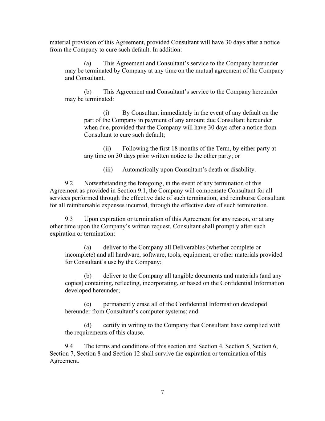 7 material provision of this Agreement, provided Consultant will have 30 days after a notice from the Company to cure such default. In addition: (a) This Agreement and Consultant’s service to the Company hereunder may be terminated by Company at any time on the mutual agreement of the Company and Consultant. (b) This Agreement and Consultant’s service to the Company hereunder may be terminated: (i) By Consultant immediately in the event of any default on the part of the Company in payment of any amount due Consultant hereunder when due, provided that the Company will have 30 days after a notice from Consultant to cure such default; (ii) Following the first 18 months of the Term, by either party at any time on 30 days prior written notice to the other party; or (iii) Automatically upon Consultant’s death or disability. 9.2 Notwithstanding the foregoing, in the event of any termination of this Agreement as provided in Section 9.1, the Company will compensate Consultant for all services performed through the effective date of such termination, and reimburse Consultant for all reimbursable expenses incurred, through the effective date of such termination. 9.3 Upon expiration or termination of this Agreement for any reason, or at any other time upon the Company’s written request, Consultant shall promptly after such expiration or termination: (a) deliver to the Company all Deliverables (whether complete or incomplete) and all hardware, software, tools, equipment, or other materials provided for Consultant’s use by the Company; (b) deliver to the Company all tangible documents and materials (and any copies) containing, reflecting, incorporating, or based on the Confidential Information developed hereunder; (c) permanently erase all of the Confidential Information developed hereunder from Consultant’s computer systems; and (d) certify in writing to the Company that Consultant have complied with the requirements of this clause. 9.4 The terms and conditions of this section and Section 4, Section 5, Section 6, Section 7, Section 8 and Section 12 shall survive the expiration or termination of this Agreement.